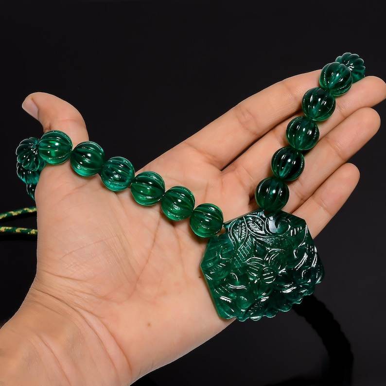 สร้อยคอจี้แกะสลักมรกต zambian ที่มีสีเขียวเข้ม