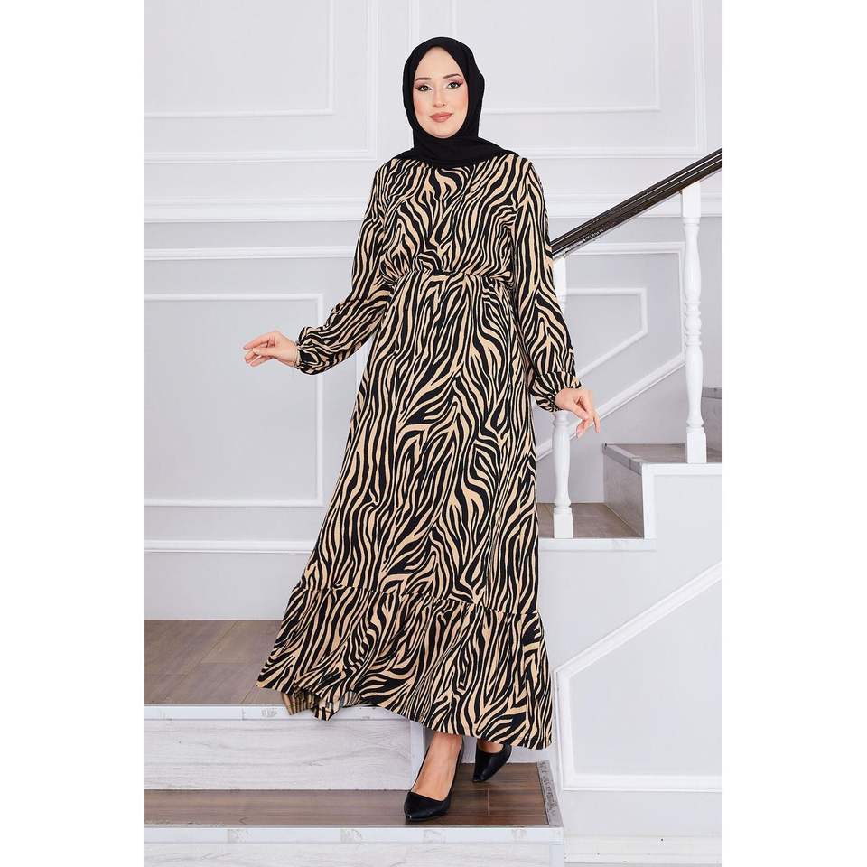 ชุดเดรสแบบเรียบร้อยผ้าเครปลายม้าลาย สีดำ ทำจากผ้าเครปพิมพ์ลายม้าลาย