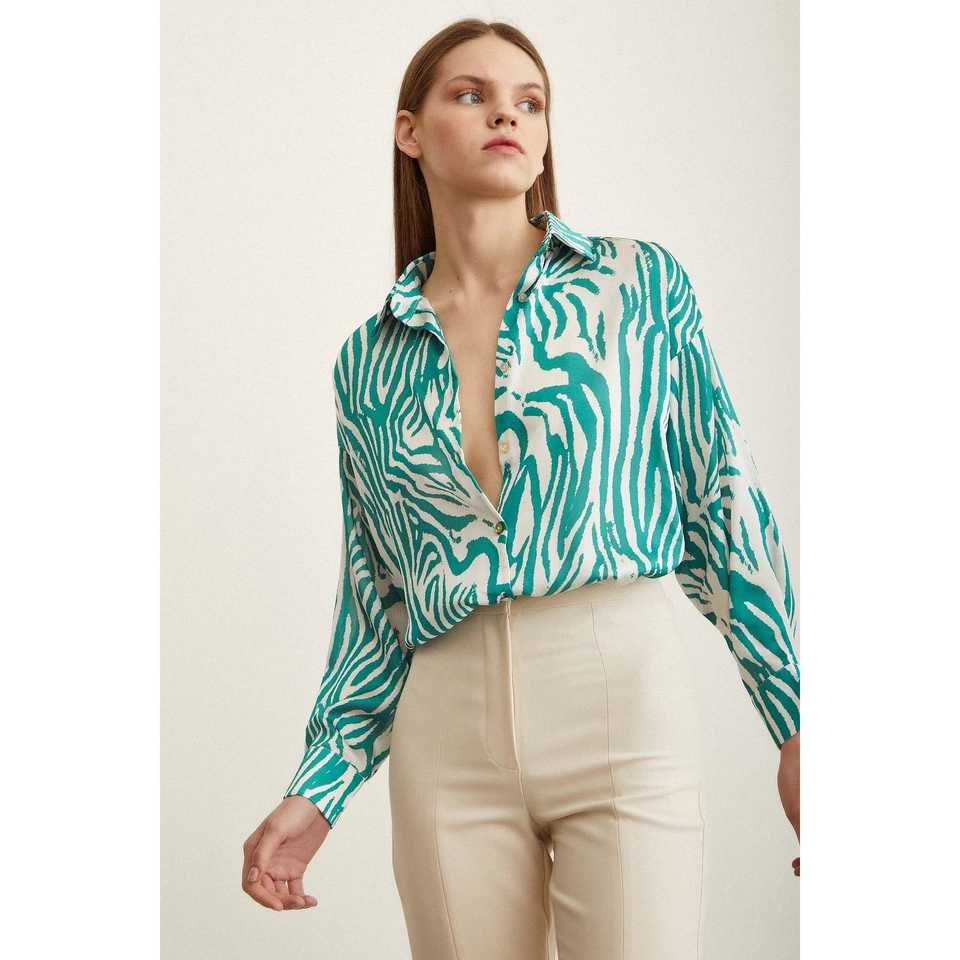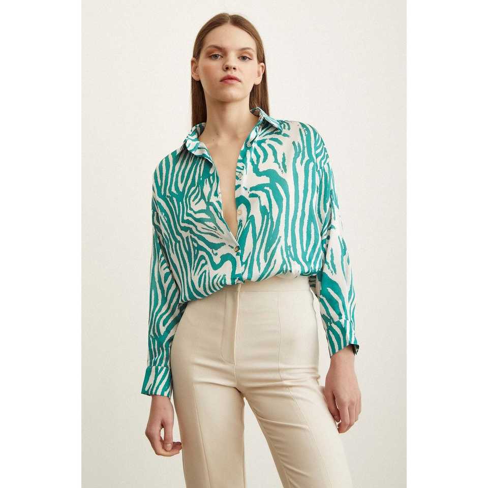 เสื้อเชิ้ตผ้าซาตินพิมพ์ลายม้าลายผู้หญิงสีเขียวติดกระดุมเสื้อลำลองสำหรับทุกวัน