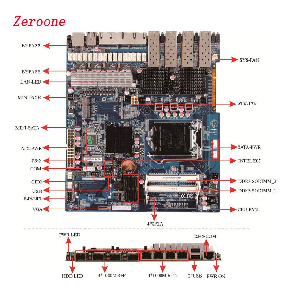 Zeroone เมนบอร์ดรักษาความปลอดภัยเครือข่าย LAN-Z87SFP-4L Intel Haswell LGA1150 Z87กับมินิ PCIE และซีพียูคูลเลอร์
