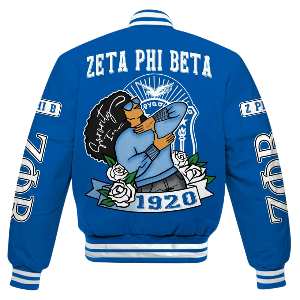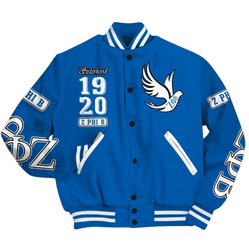 Zeta phi เสื้อแจ็กเก็ตทีมตัวแทนชมรม zpb 1920สีฟ้าสีขาว zpb แจ็คเก็ตเลตเทอร์แมนฉบับกรีกแผ่นปะ