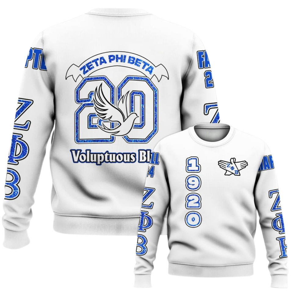 เสื้อสเวตเตอร์คอกลมปักลาย1920 Zeta phi เบต้าสำหรับผู้หญิงสีน้ำเงินเข้มลายตัวอักษรกรีก