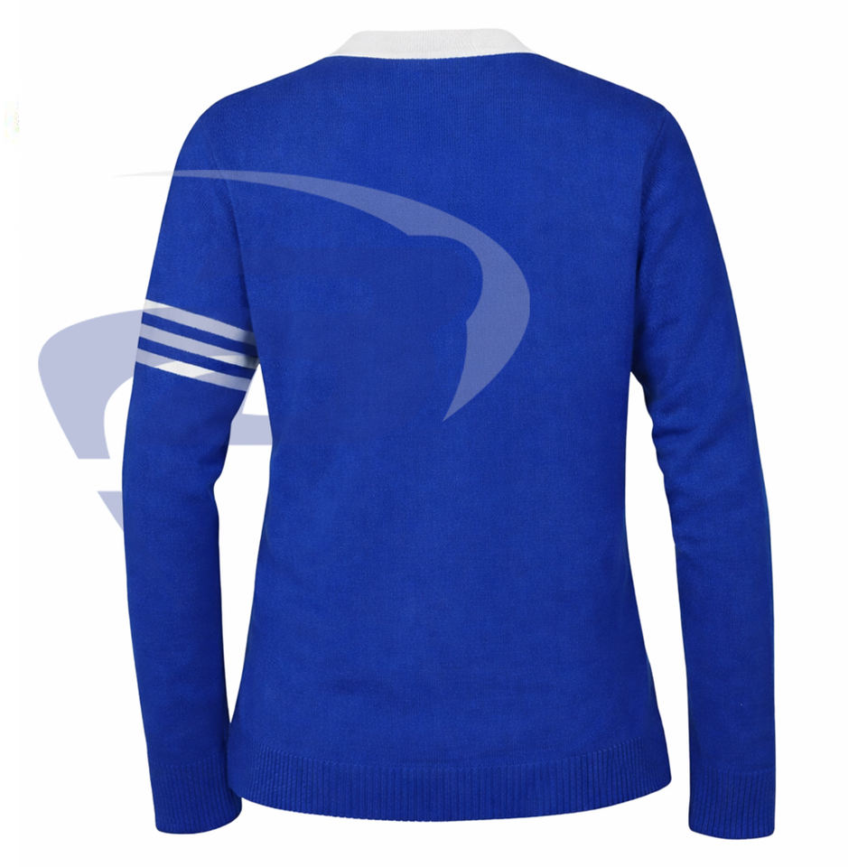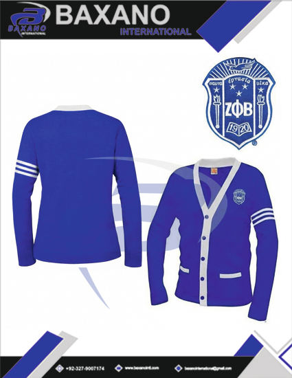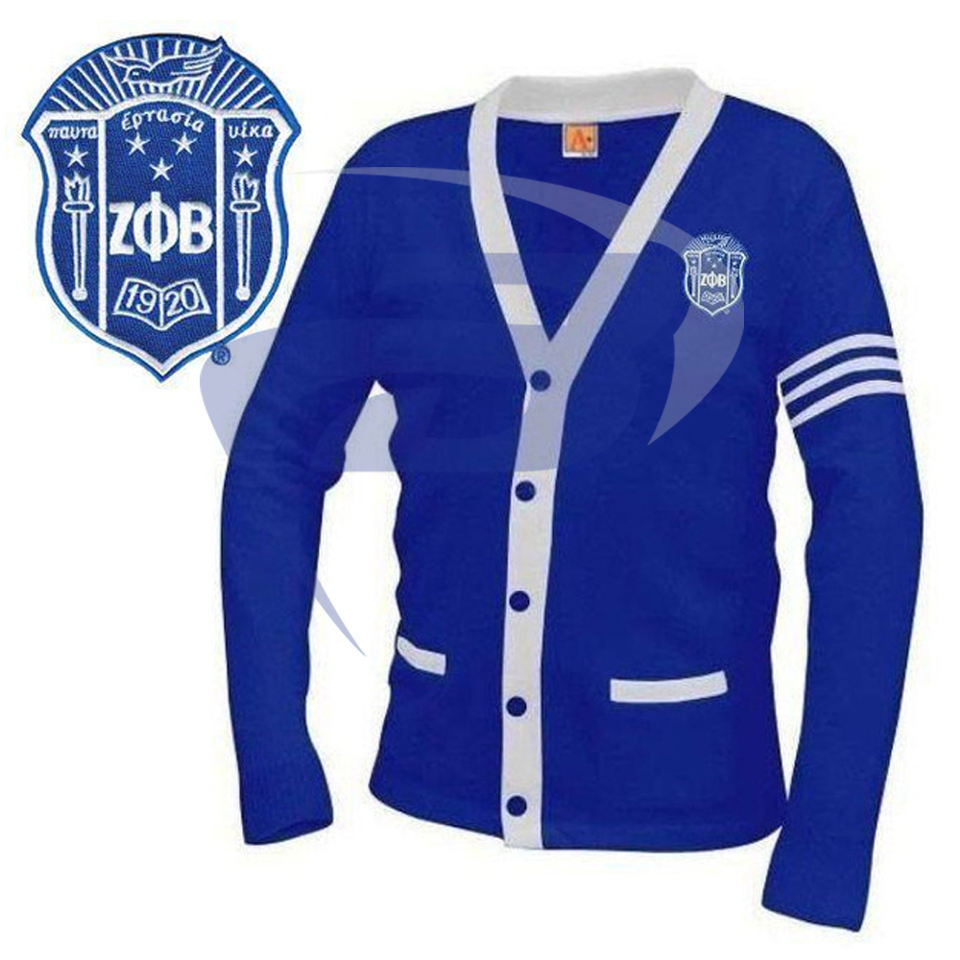 เสื้อคาร์ดิแกน Zeta Phi Beta Sorority สีน้ำเงินรอยัล ถักลายทางสีขาว พร้อมโลโก้ปัก ZPB ชุดนักกีฬามหาวิทยาลัย ชีวิตแบบกรีก