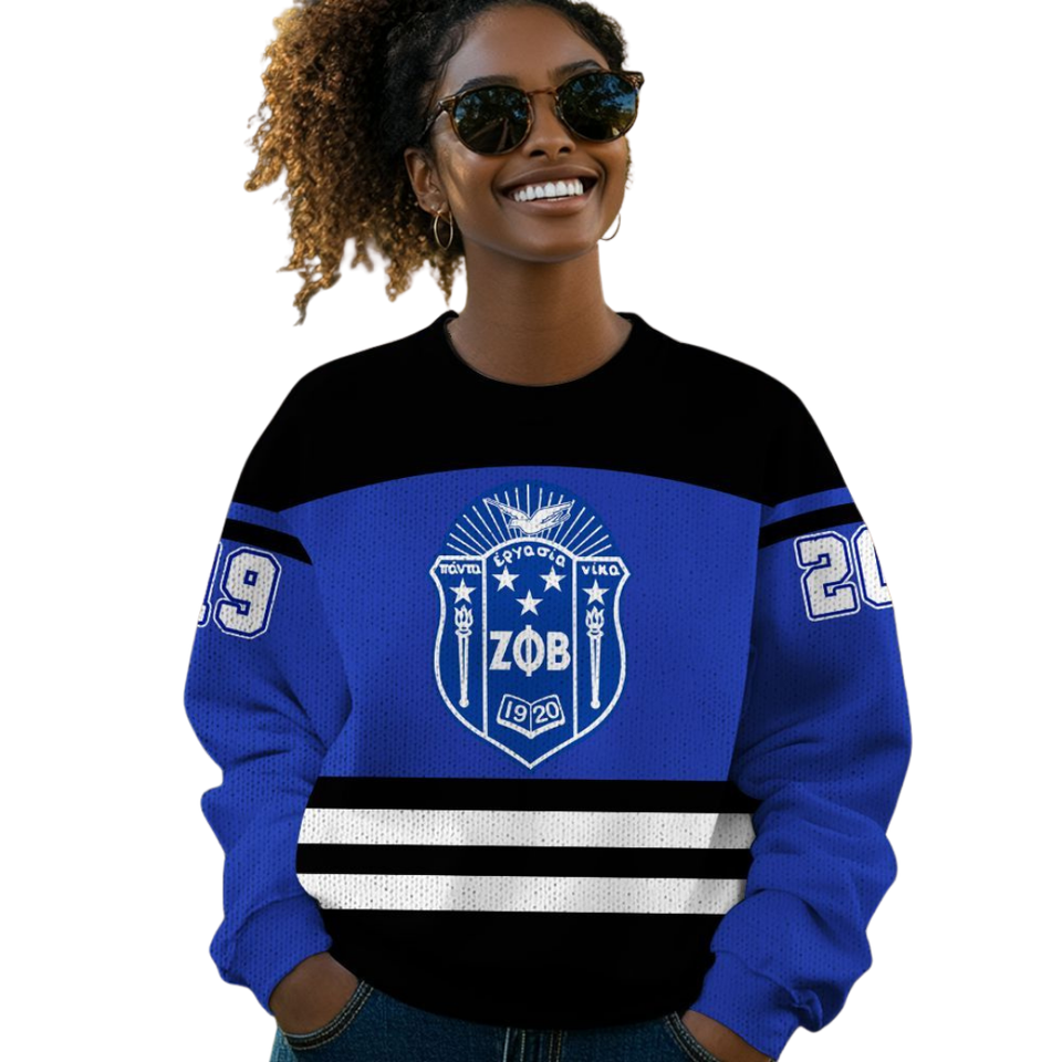 Zeta Phi Beta Sorority Greek Life Winter Front Logo Sweater 1920 ZPhiB Knit Blue White Chenille Embroidery Divine Nine