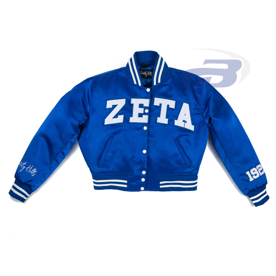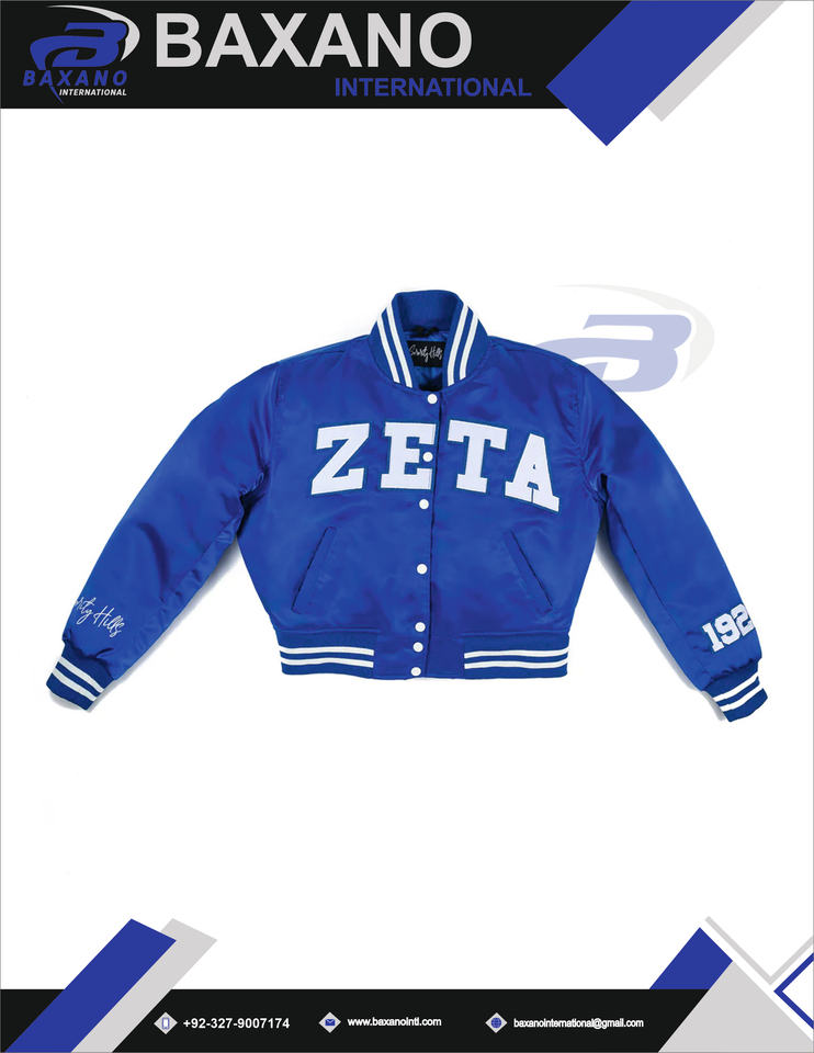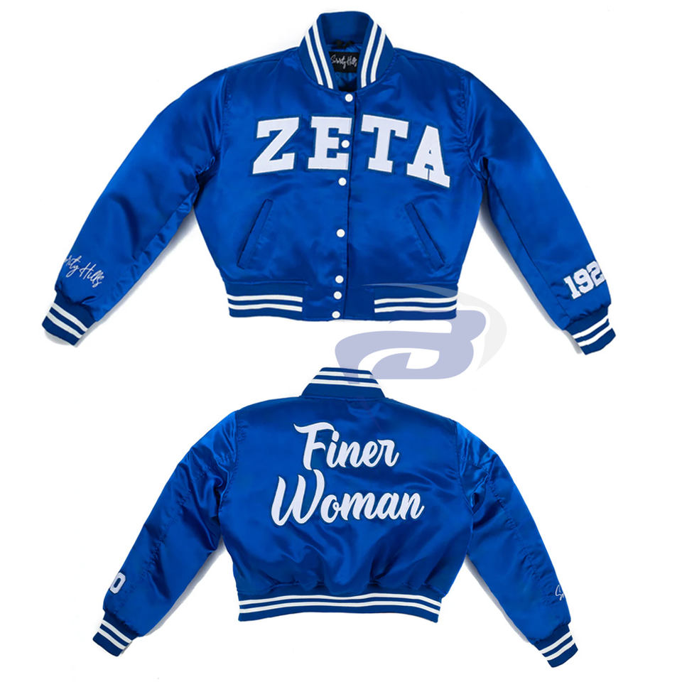 Zeta phi เบต้าแจ็คเก็ตบอมเบอร์ซิกเนเจอร์ของสมาคมสมาคมผู้หญิงเสื้อแจ็คเก็ตสีน้ำเงินแบบดั้งเดิมสไตล์กรีกปักแบบพรีเมียมแจ็คเก็ตใส่ได้ทั้งชายและหญิง