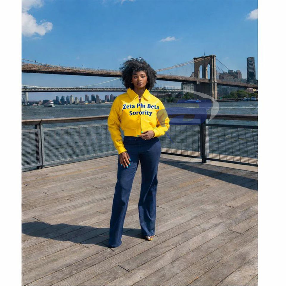 เสื้อแจ็คเก็ตวาร์ซิตี้แบบปกติของชมรมนักศึกษาหญิง Zeta Phi Beta งานปักลายชมรมนักศึกษากรีก ทำจากหนัง PU สไตล์สตรีทแวร์ พร้อมดีไซน์แบบกำหนดเอง