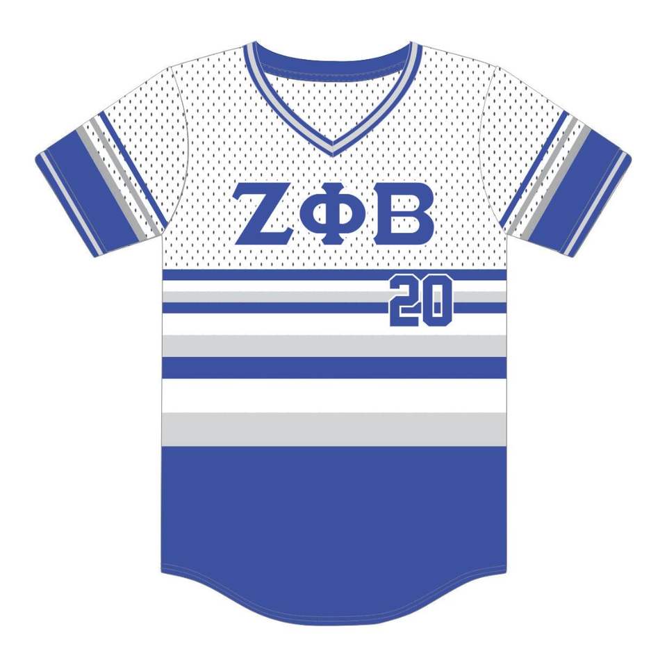 Zeta Phi เบต้าเสื้อเบสบอลสวมหัวสีขาว100% ผ้าโพลีเอสเตอร์ตาข่ายเสื้อผ้าเสื้อคอวีปักลาย