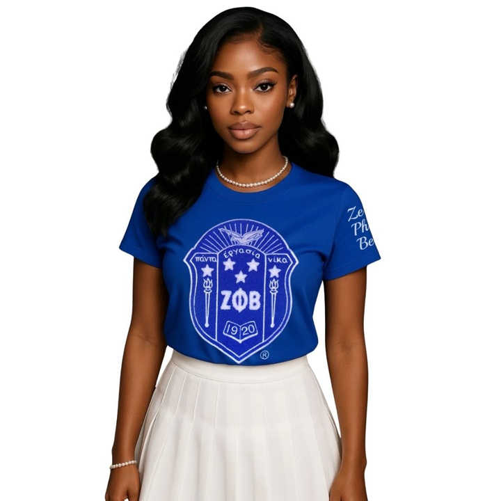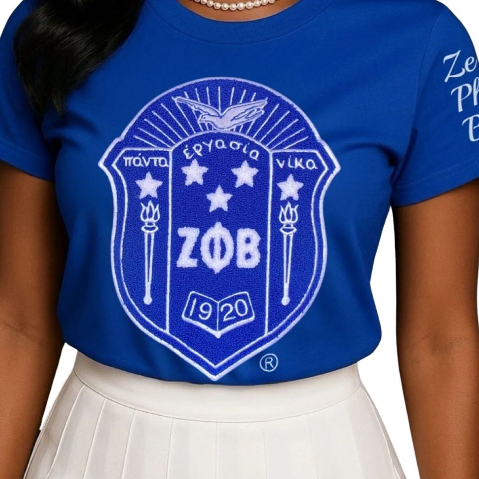 เสื้อยืด Zeta Shield Chenille สีน้ำเงิน ปักลายสีขาว ตราสัญลักษณ์ชมรม ชุดนักศึกษา ผ้าฝ้าย ลายปักสำหรับผู้หญิง