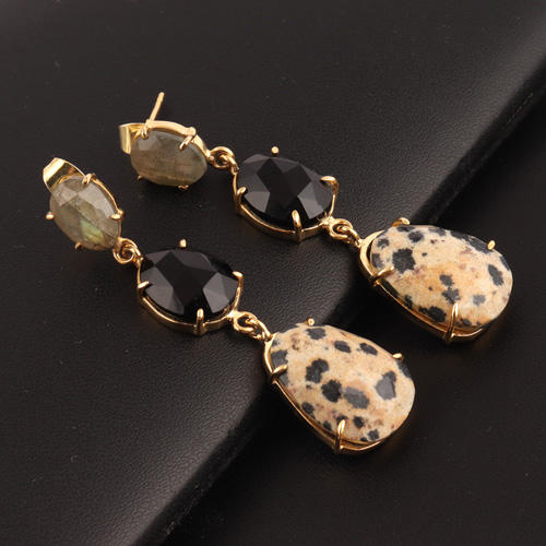 Zeva ที่ทันสมัยตรวจสอบตัดลาบราดอไรต์ธรรมชาติ,สีดำนิลและดัลเมเชี่ยนแจสเปอร์ต่างหูทอง/เงินชุบห้อยต่างหู