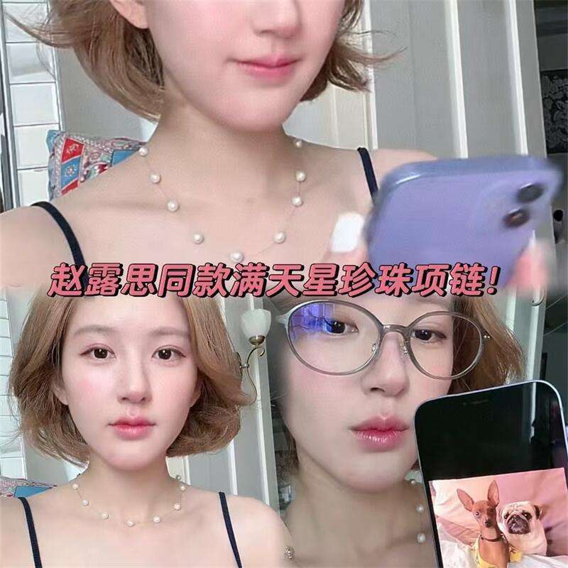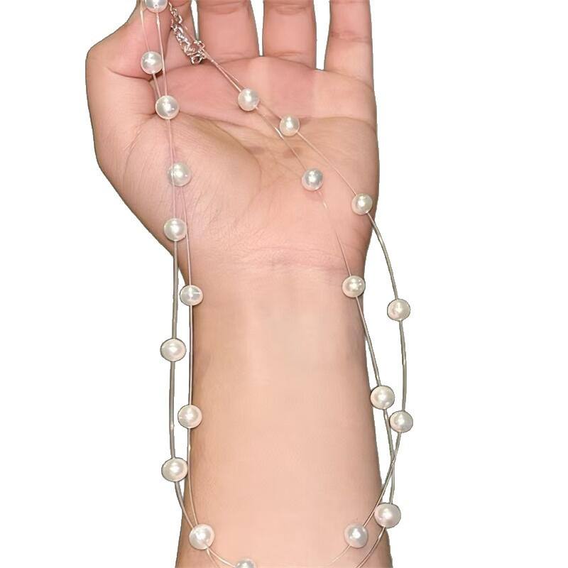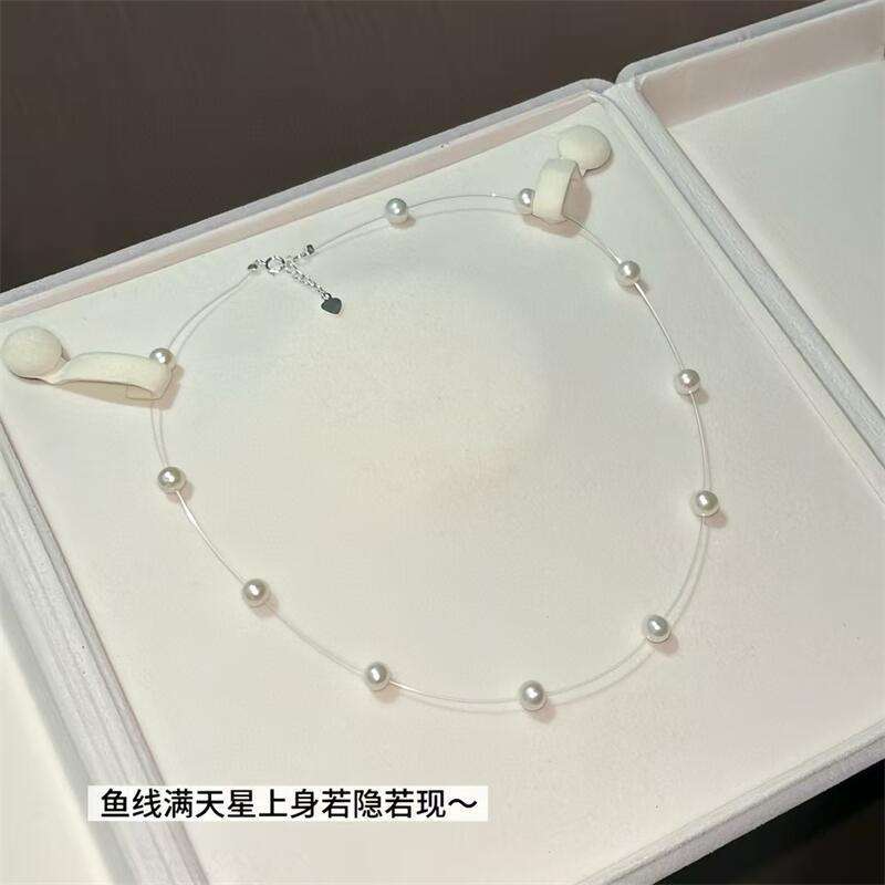 สร้อยคอมุกอะโกย่าน้ำจืดธรรมชาติ ดาวเต็มฟ้า ของเจ้าอ๋อ รูธ แบบใส ตัวเรือนเงินแท้ S925 สายแบบสายเอ็นตกปลา สไตล์เดียวกับที่ดาราใช้
