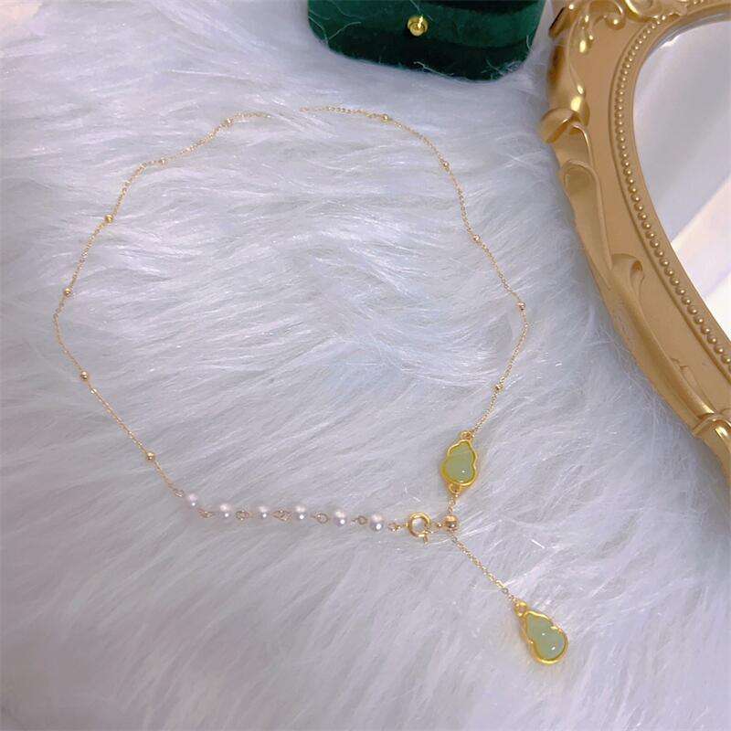 สร้อยคอมุกน้ำจืดพรีเมียม จื่อเจิน รุ่นสตาร์รี่สกาย ฟูลู พร้อมสายรูปตัว Y ประดับแก้วทรงน้ำเต้า ปรับความยาวได้