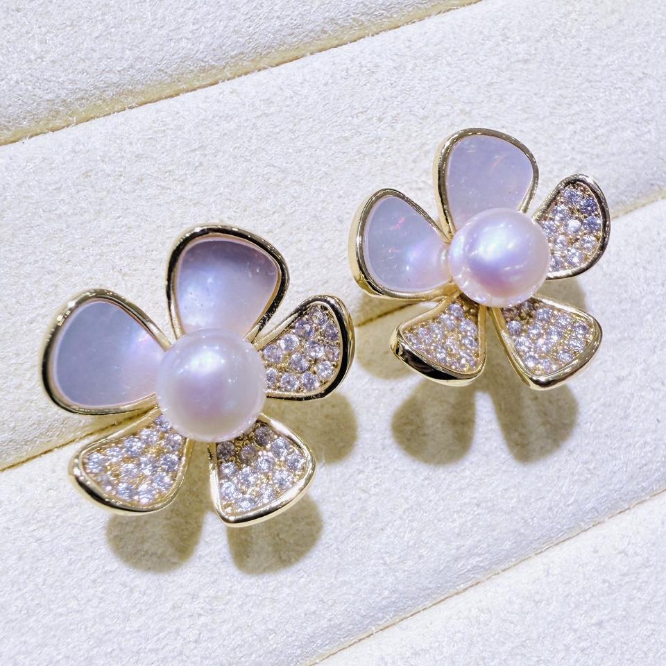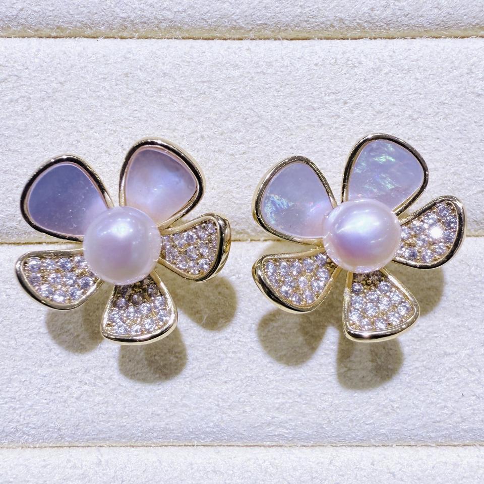 ต่างหูมุกน้ำจืดชุบทอง 14K จูจี้ ดีไซน์ดอกไม้ประดับเปลือกหอยมุกและคริสตัล แฟชั่นทันสมัย ใช้งานได้หลากหลาย