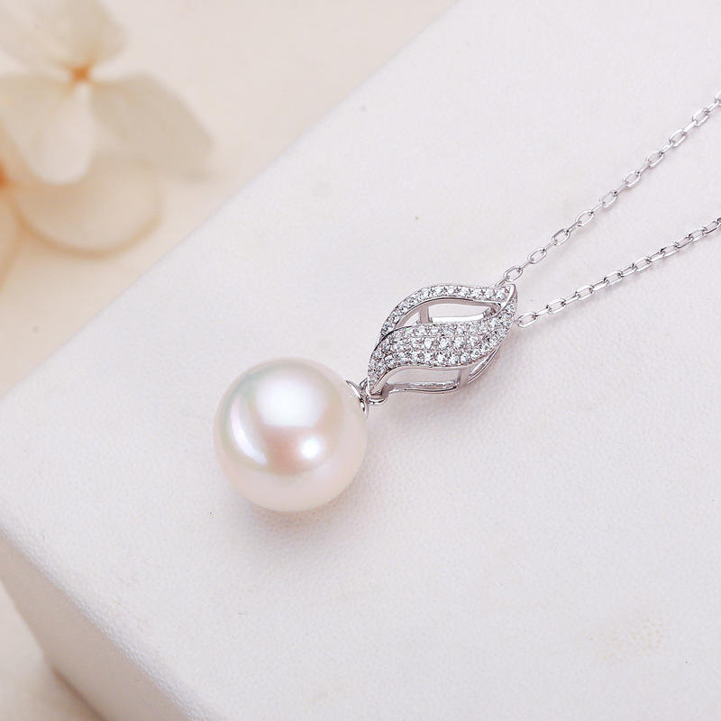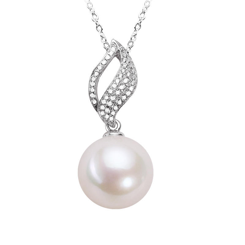 สร้อยคอมุกน้ำจืดทรงกลมขนาด 11-12 มม. สำหรับผู้หญิงจาก Zhuji Jewelry พร้อมจี้เงินประดับเพชรซิร์คอน ตำหนิเล็กน้อย-ขายส่ง