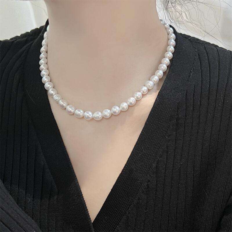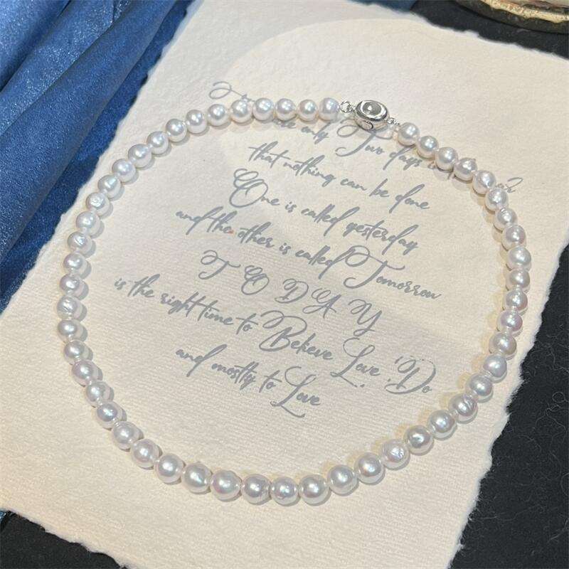 สร้อยคอมุกน้ำจืดหรูหราแบบบาร็อค จูจี้ ตัวล็อคเงินแท้ S925 มีตำหนิเล็กน้อย แต่สะท้อนแสงได้ดี เหมาะสำหรับวันแม่