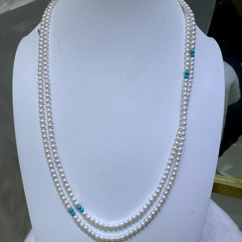 สร้อยคอมุกน้ำจืดธรรมชาติจูจี้ ขนาด 4-4.5 มม. ทรงกลม คุณภาพดีมาก มีตำหนิเล็กน้อย สีออโรร่า น้ำทะเลเทอร์ควอยซ์ ความยาว 120 ซม.