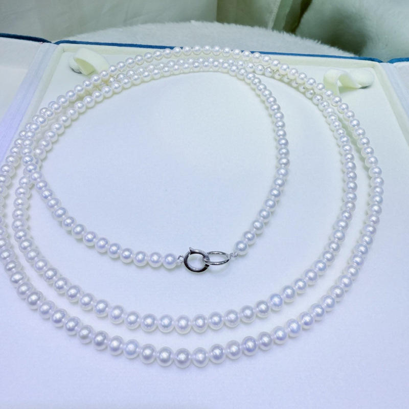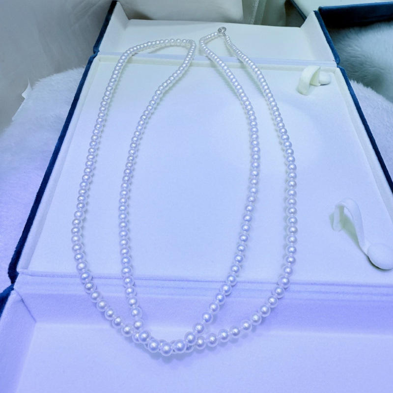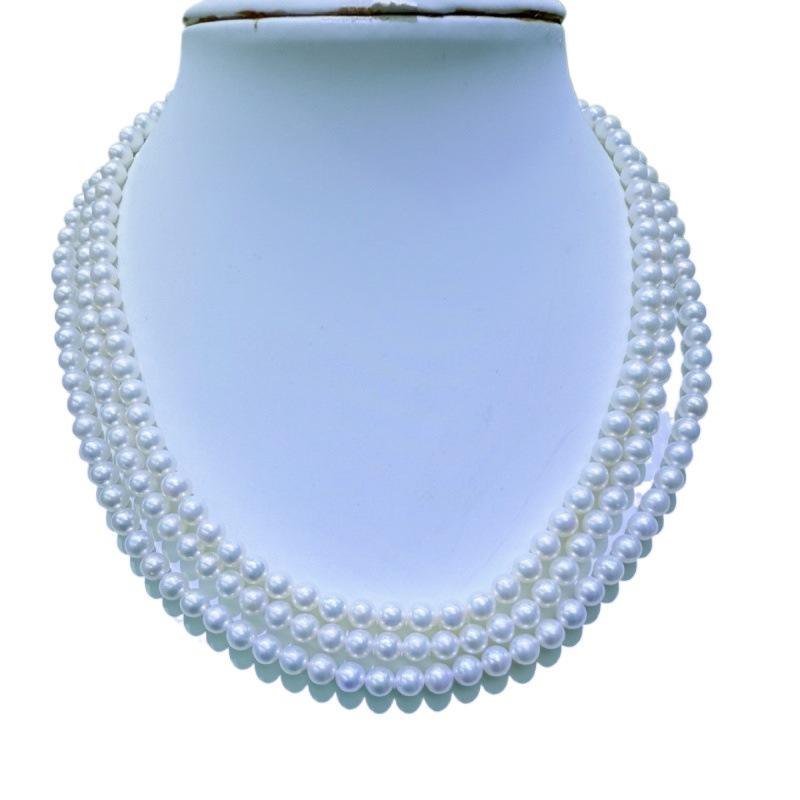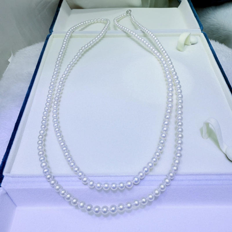 สร้อยคอมุกน้ำจืดธรรมชาติจูจี้ ขนาด 5-6 มม. ทรงกลม แทบไร้ตำหนิ ความยาว 115-120 ซม. ตัวล็อคเงินแท้ ดีไซน์แบบซ้อน