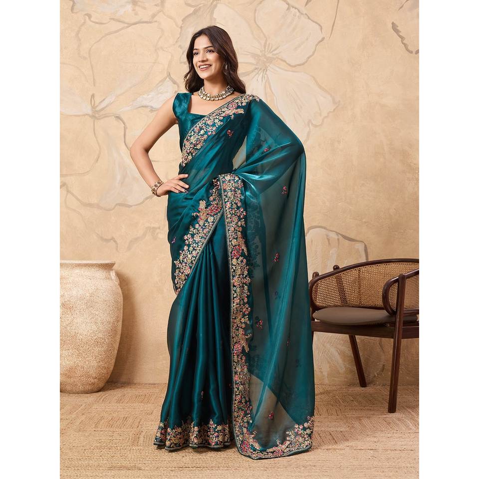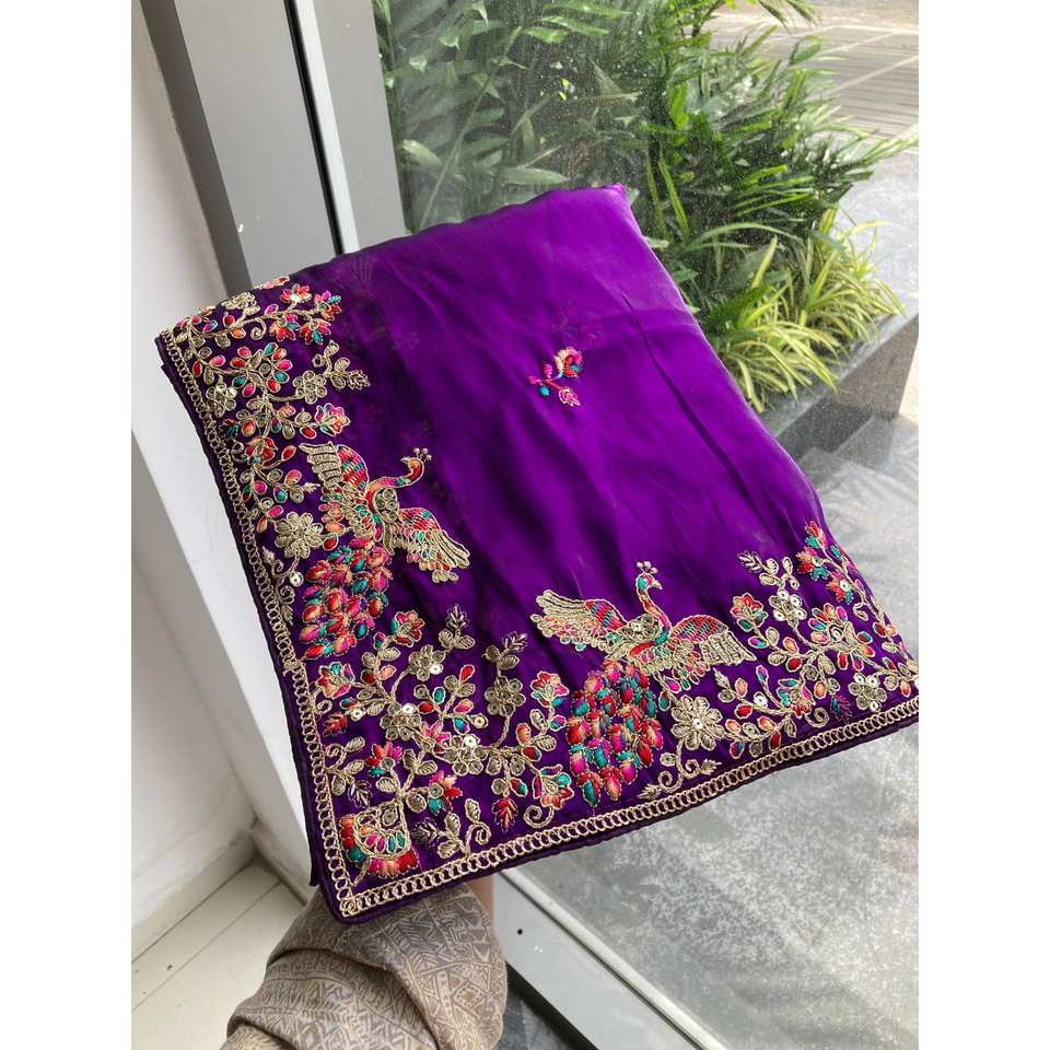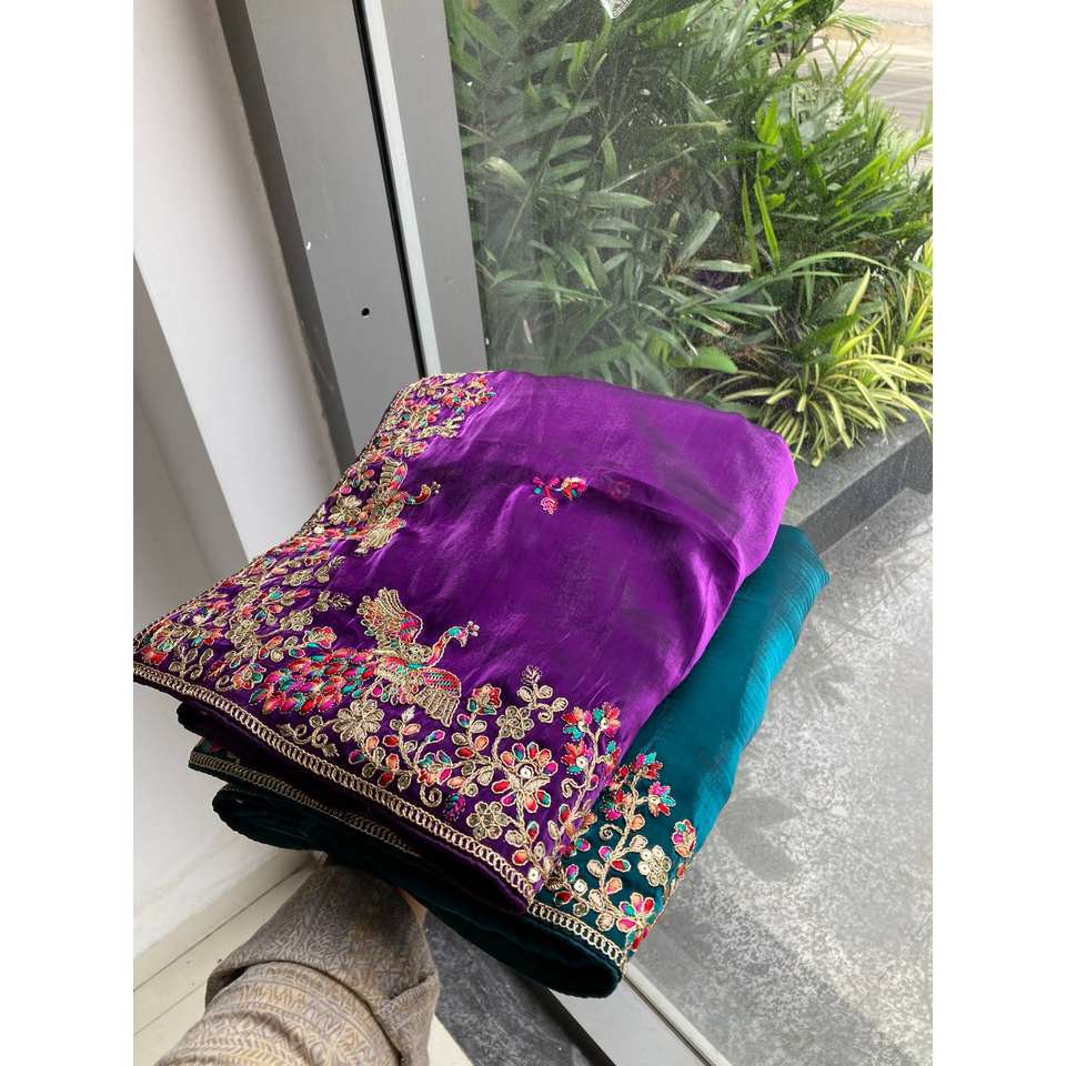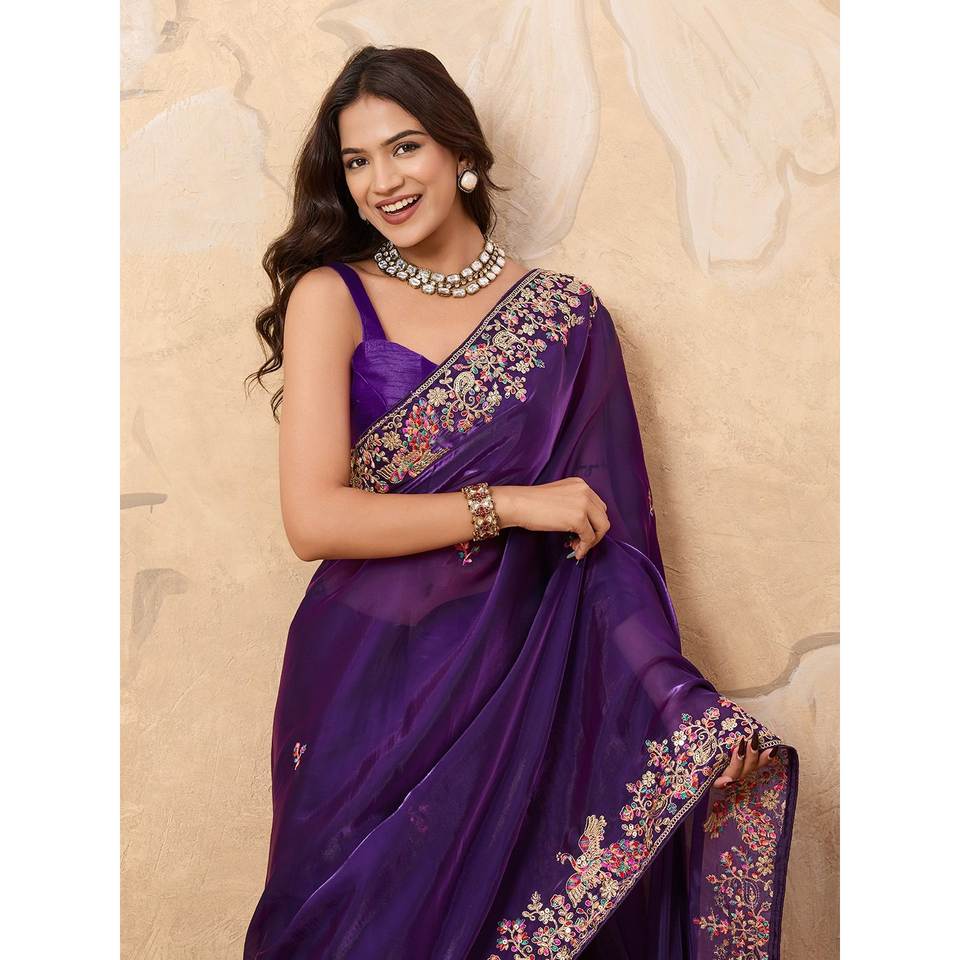 ซิมมี่ ชู ชุดส่าหรีสีม่วงทำมือสำหรับงานปาร์ตี้ ลายดอกไม้ พร้อมงานปักเลื่อมและขอบผ้าฉลุ 100% โพลีเอสเตอร์กำมะหยี่