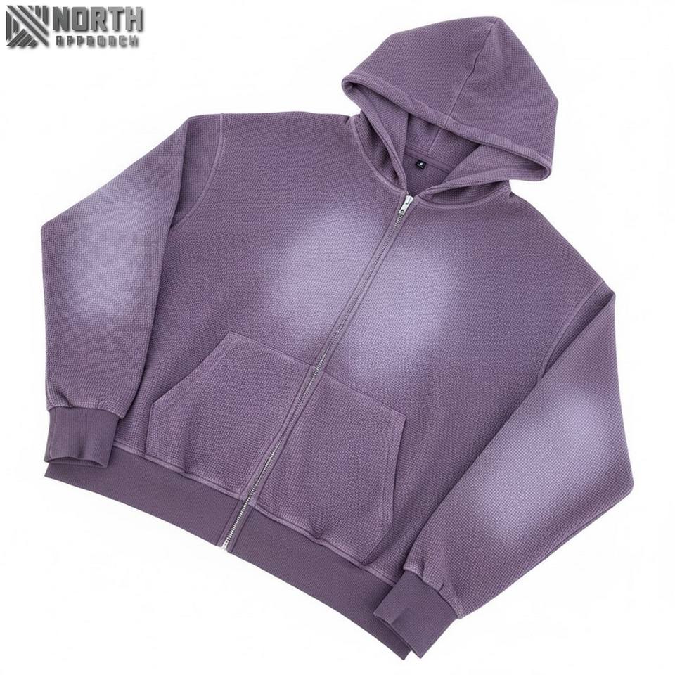 เสื้อมีฮู้ดผ้าเกล็ดปลาแบบมีซิปรุ่นเฮฟวีเวตผ้าเฟรนช์เทอร์รี่วาฟเฟิลเครื่องแต่งกายแนวสตรีทแวร์เสื้อมีฮู้ดแบบมีซิปสีจางออกแบบได้ตามต้องการผู้ผลิตเสื้อมี450จีเอสเอ็ม