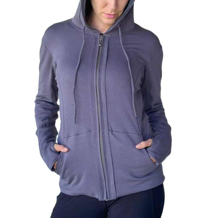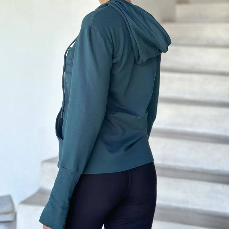 เสื้อแจ็คเก็ตสปอร์ตแขนซิปสำหรับผู้หญิง ผ้าฝ้ายผสมใยไผ่ ซิปแบบมีฮู้ด สามารถปรับแต่งได้ พร้อมกระเป๋า