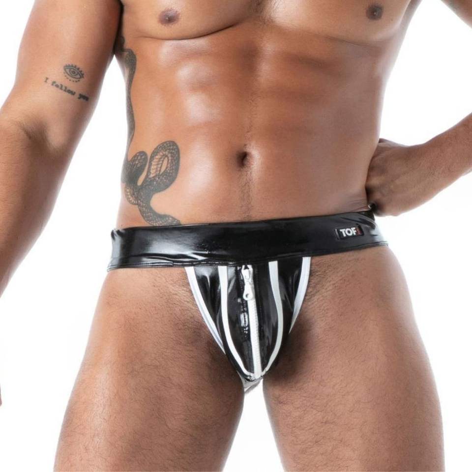 จ็อคสแตรปแบบมีซิป ลาเท็กซ์ ซีคันด์สกิน สีดำ สำหรับผู้ชาย เสื้อผ้าคลับแวร์แนวเฟติช เซ็กซี่ พร้อมกระเป๋าใส่ของ