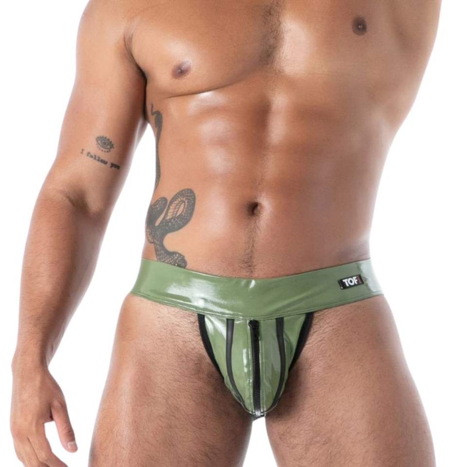 จ็อคสแตรปแบบมีซิป ลาเท็กซ์ ซีคันด์สกิน สีกากี สำหรับผู้ชาย เสื้อผ้าคลับแวร์แนวเฟติช เซ็กซี่ พร้อมกระเป๋าใส่ของ