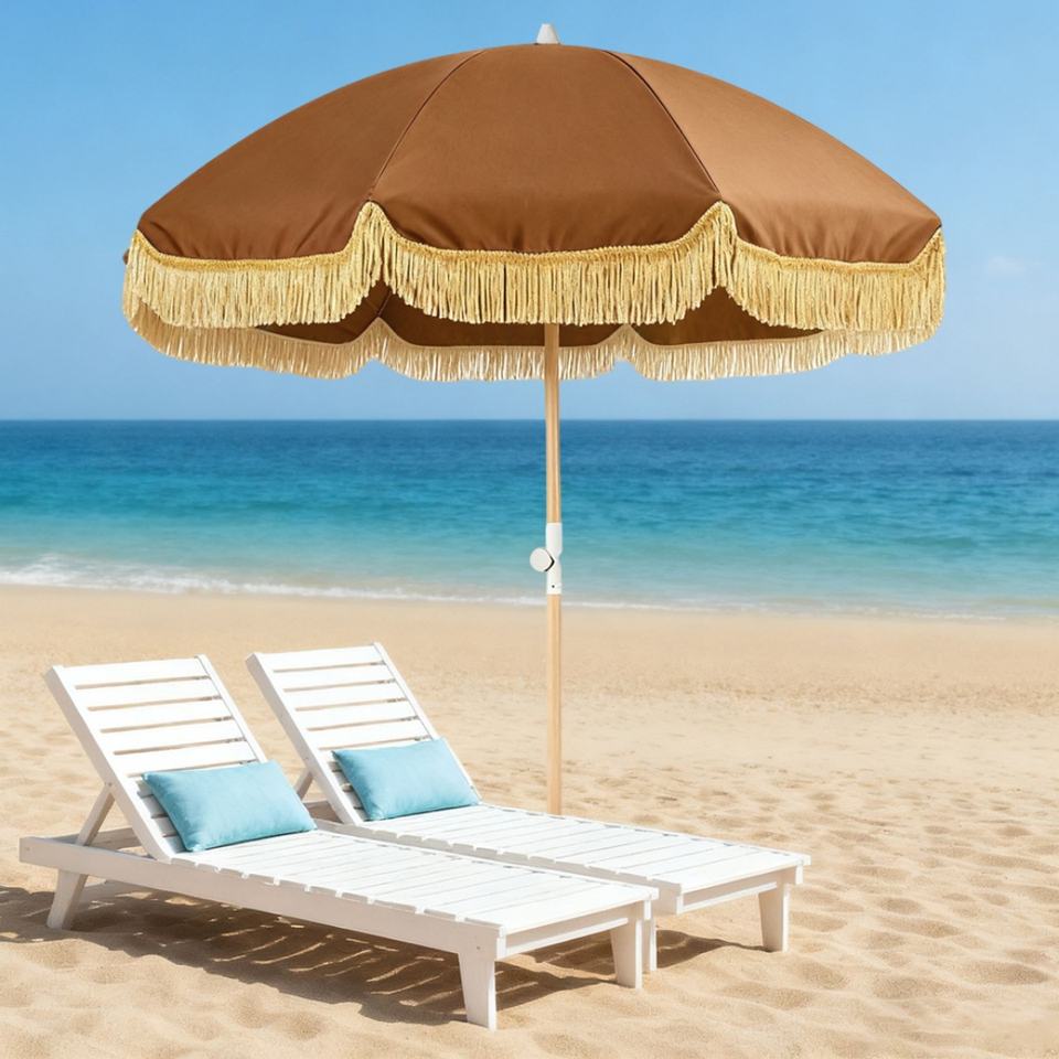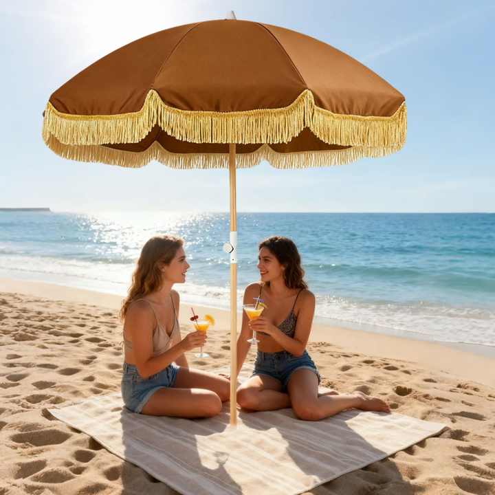 ร่มชายหาดแบบมีซิปพร้อมพู่ห้อย ขนาด 6 x 6 ฟุต ร่มชายหาดสไตล์โบฮีเมียนพร้อมพู่ห้อย ติดตั้งง่าย