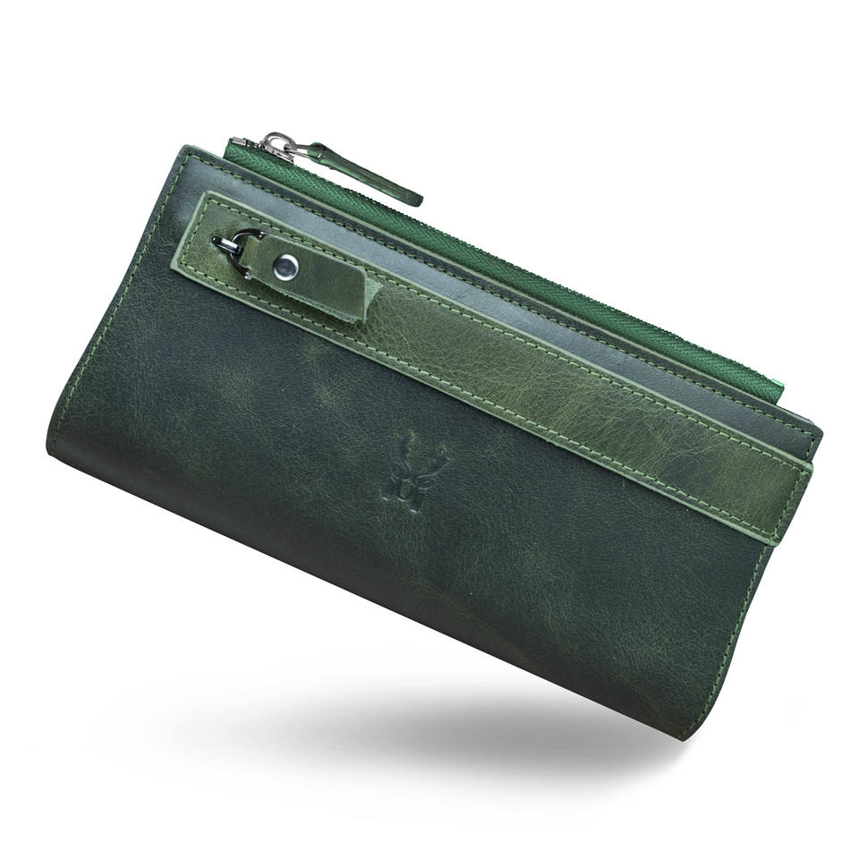 กระเป๋าสตางค์หนังแท้แบบมีซิปสายคล้องมือดีไซน์พิเศษสีกากีสีเขียวขนาด9.5ซม.-18.5ซม.-2ซม. ผลิตจากไก่งวงพรีเมียม