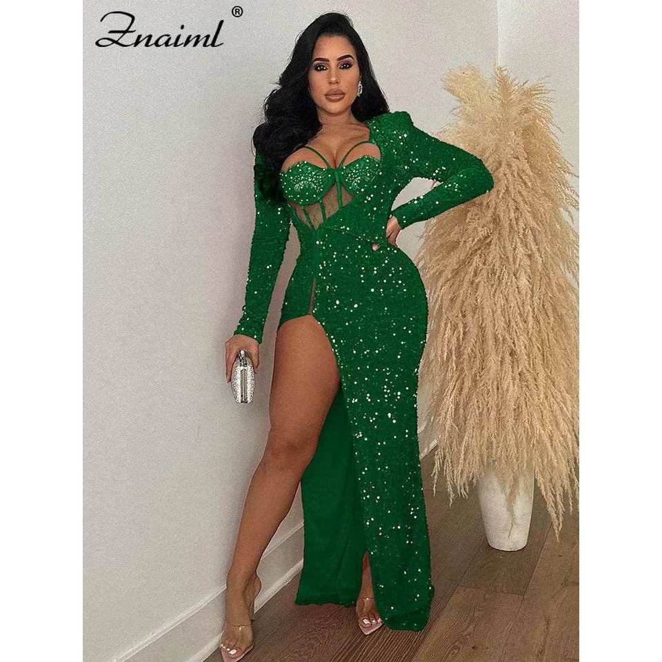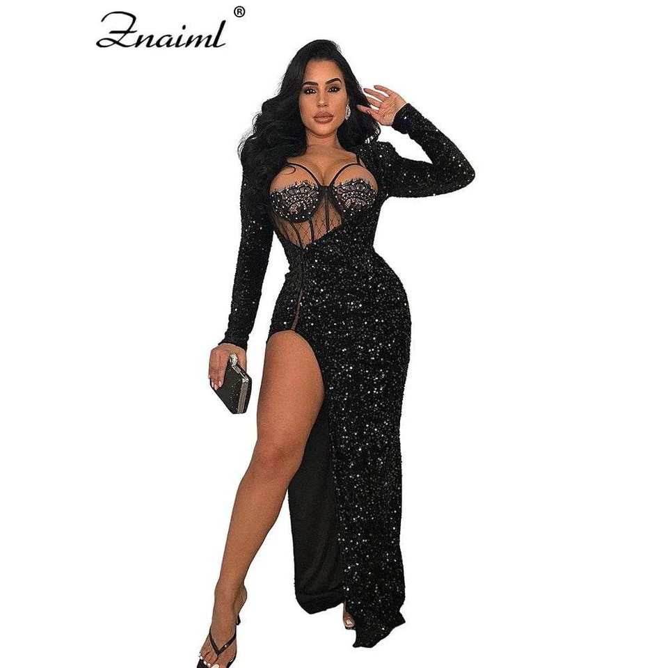 Znaiml Women's Luxury Evening Dresses Sexy Lace High Split Sequins for Christmas Night Party Birthday Vestidos for Special