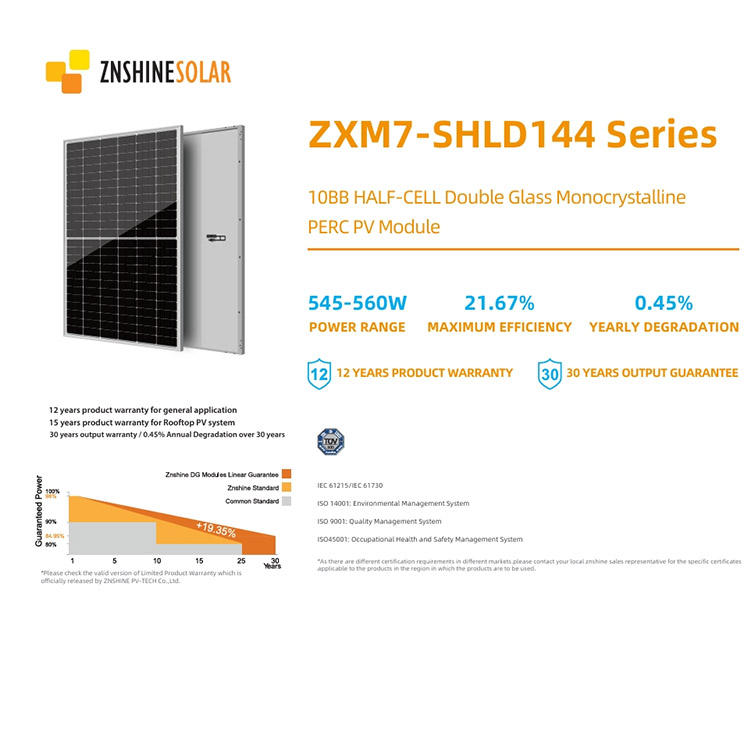 Znshine ZXM7-SHLD144โซลาร์เซลล์545-560วัตต์ znshine 545 550 555 560วัตต์ znshine กระจกคู่แผงโมโน PERC PV ในกวางโจว