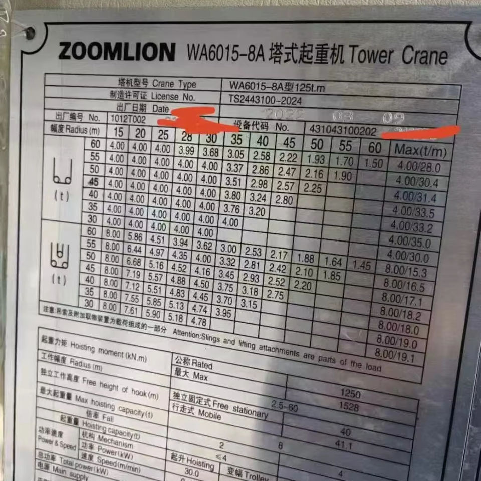 รถเครนติดตั้งบนหอคอยแบบแบน Zoomlion ปี 2022 มือสอง รุ่น WA6015-8A แขนยืด 60 เมตร