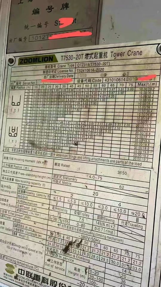 รถเครนทาวเวอร์ Zoomlion 7530 ปี 2019 สภาพใช้งานแล้ว