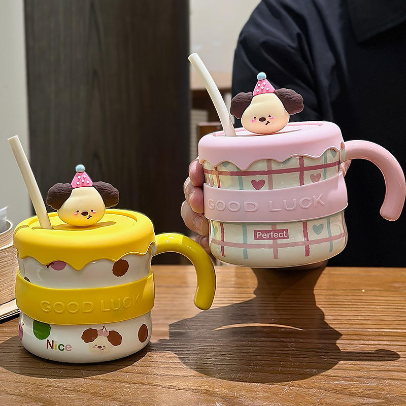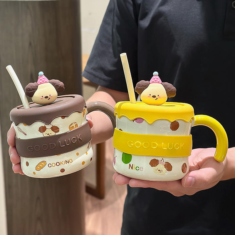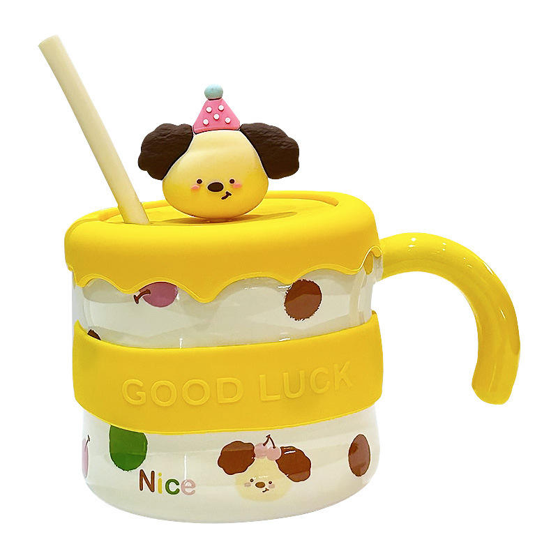 แก้วการ์ตูนลูกสุนัข Zuo Mu พร้อมฝาและหลอด 300 มล. ลายนำโชค สำหรับเป็นของขวัญเด็กผู้หญิง ฤดูใบไม้ผลิ 2025