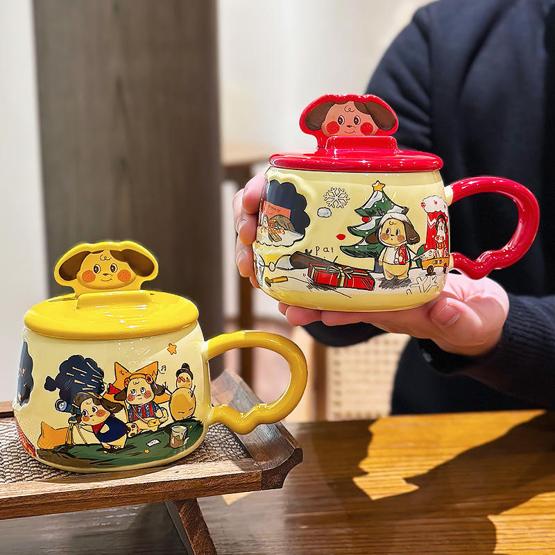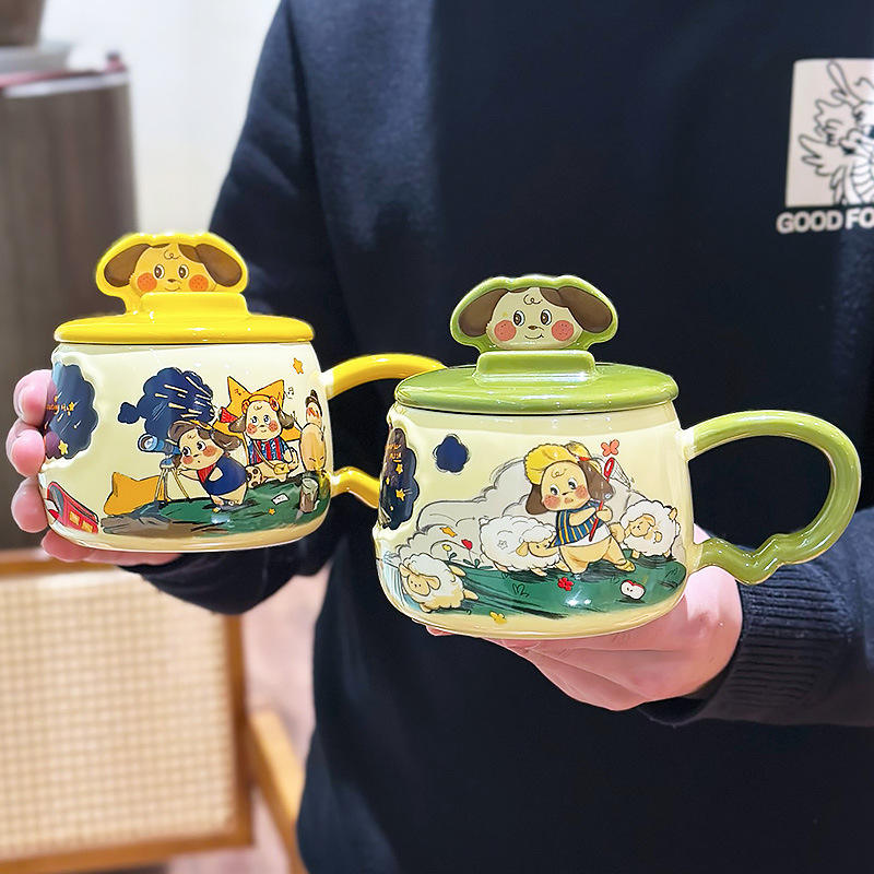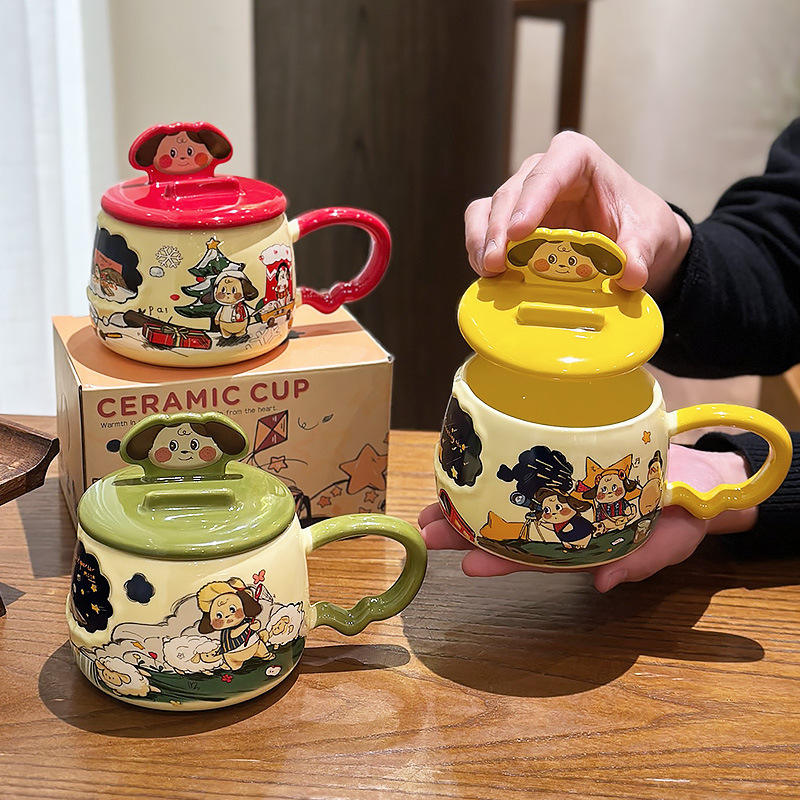 แก้วเซรามิก Zuo Mu พร้อมฝาและหูจับ ลายเพ้นท์มือ ทนความร้อน เหมาะสำหรับเป็นของขวัญ ฤดูหนาว 2025