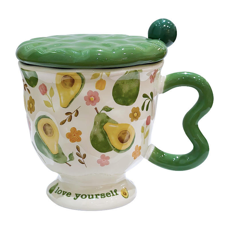 แก้วเซรามิก Zuo Mu พร้อมฝาและช้อน ลายผลไม้เพ้นท์มือ ทนความร้อน แก้วกาแฟสำหรับออฟฟิศ ของขวัญสำหรับสาวๆ