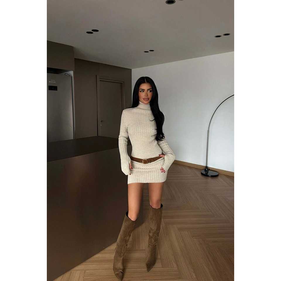 Zurich ชุดเดรสถักด้วยหิน, ชุดเดรสลำลองสไตล์สตรีทแวร์เอวธรรมชาติฤดูหนาวพิมพ์ขนสัตว์ตรงเงาและยาวถึงพื้น