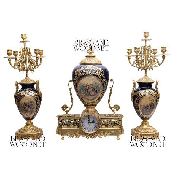 ชุดนาฬิกาเครื่องลายครามและทองเหลืองโบราณพร้อมเชิงเทียนสไตล์วินเทจทำด้วยมืออุปกรณ์ตกแต่งบ้านที่หรูหรา