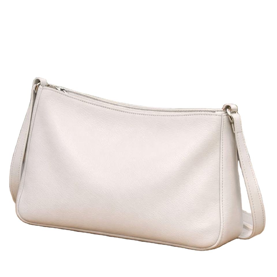 ดูเหมือนเป็นกระเป๋าสะพายไหล่หนังสีขาวที่มีดีไซน์คล้ายกับกระเป๋าสะพายไหล่หรือกระเป๋าถืออเนกประสงค์