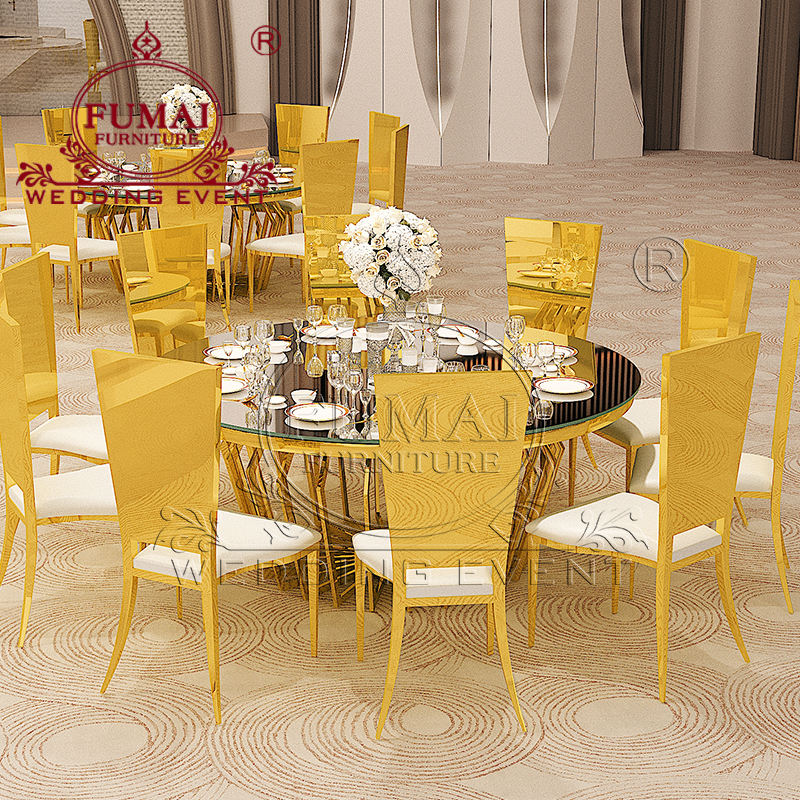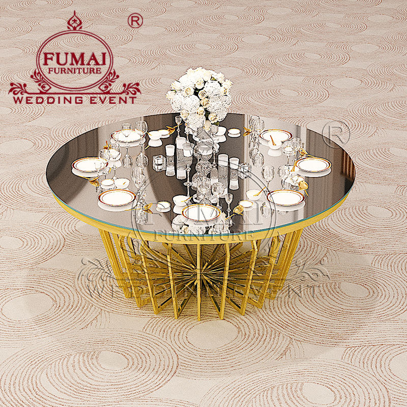 โต๊ะรับประทานอาหารทรงกลมดีไซน์สวยงามพร้อมท็อปกระจกสำหรับงานแต่งงานเจ้าบ่าวเจ้าสาวพร้อมขาตั้งสีทอง