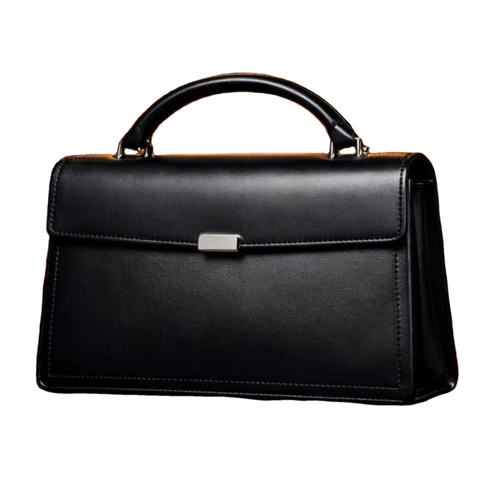กระเป๋าถือทรงคลาสสิกแบบมีหูหิ้ว ทำจากหนังสีดำ ดูคล้ายกับกระเป๋าแบรนด์ Bag