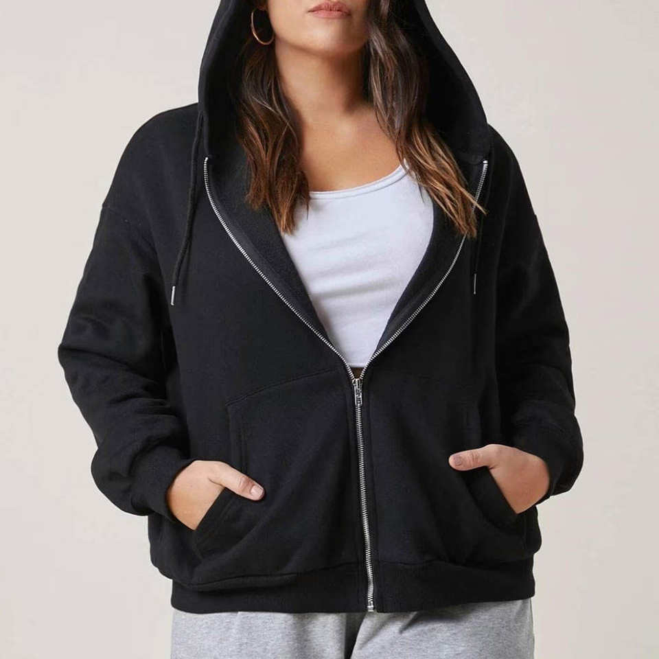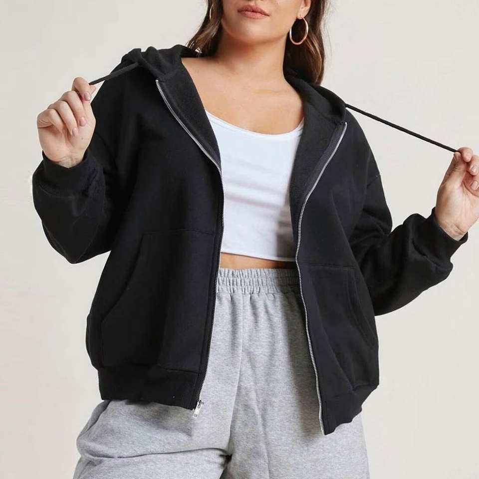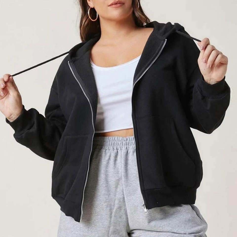 เสื้อฮู้ดซิปผู้หญิงสีดำ ผ้าฟลีซนุ่มสบาย สวมใส่ได้ทุกวัน แฟชั่นฤดูหนาว