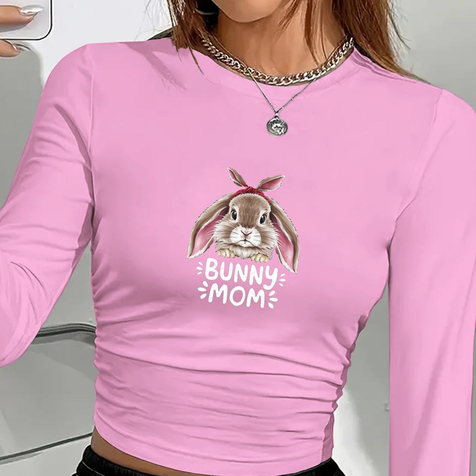 เสื้อยืดแขนยาวผู้หญิง Bunny Mom คอกลม พิมพ์ลาย ผ้าถัก ผสมสแปนเด็กซ์ โพลีเอสเตอร์ แขนยาวเต็มตัว ทรงปกติ ใส่ได้ทุกฤดู สไตล์ Y2K