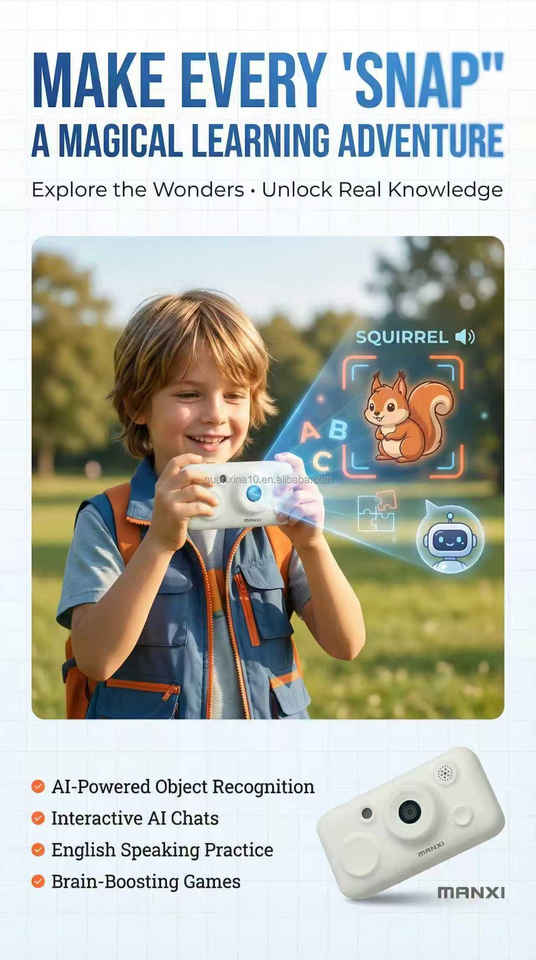 กล้องดิจิตอล AI สำหรับเด็ก 8 รูปแบบ พร้อมฟังก์ชันจดจำภาพด้วย AI และหน้าจอ IPS ขนาด 4.0 นิ้ว เพื่อการเรียนรู้และความสนุกสนาน