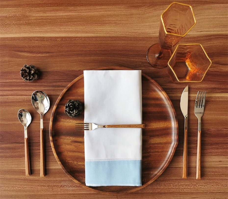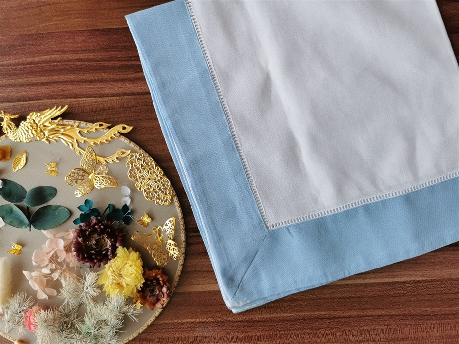 ผ้าเช็ดปากฝ้ายออร์แกนิคผ้าฝ้ายผสมขอบเย็บริมผ้าลินินสำหรับร้านอาหารงานแต่งงานงานค็อกเทลสีฟ้าคลาสสิกทำด้วยมือ