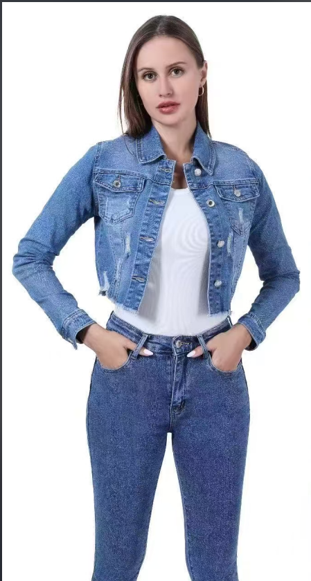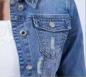 แจ็กเก็ตยีนส์ครอปสำหรับผู้หญิงประดับเพชรแบบเจาะรูสำหรับฤดูใบไม้ผลิฤดูใบไม้ร่วง