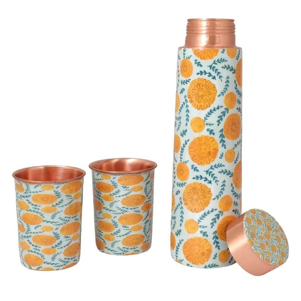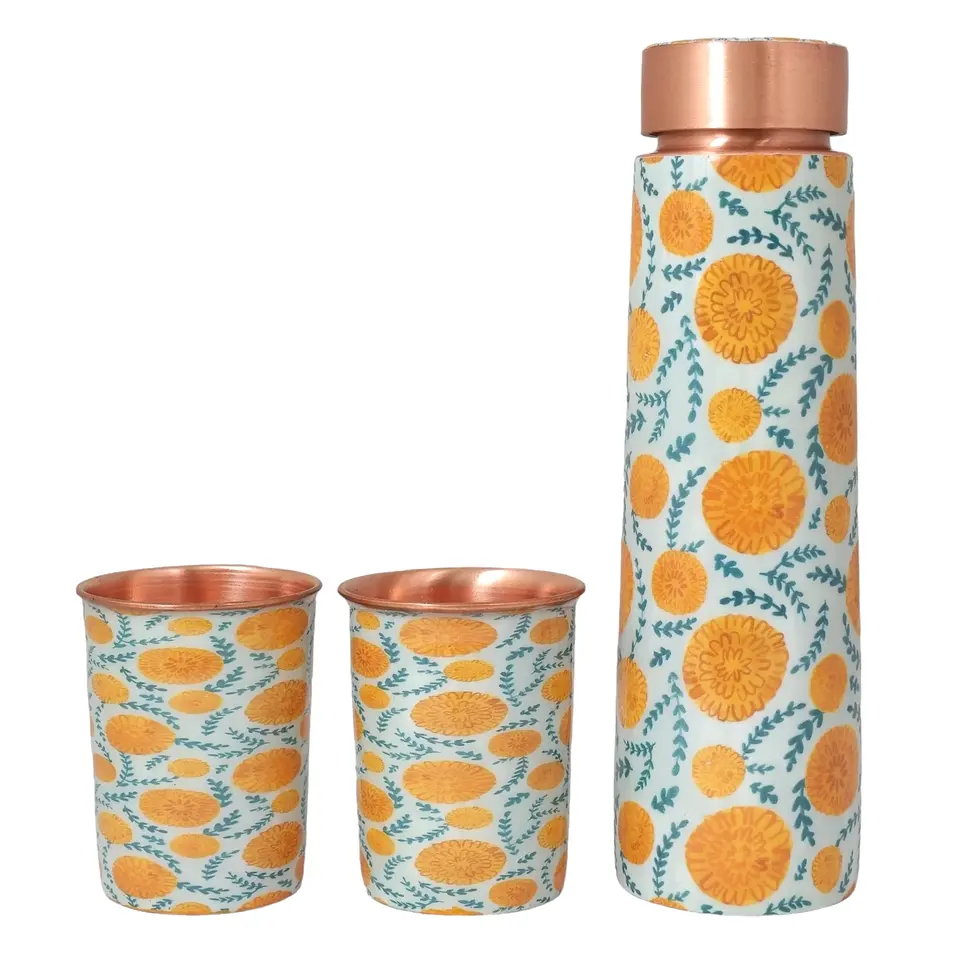 ชุดขวดทองแดงพร้อมแก้วลายมีนา พื้นหลังสีขาว ลายดอกไม้สีเหลือง ใบไม้สีเขียว ชุดงานศิลปะ 2 ชิ้น ทำจากแก้ว