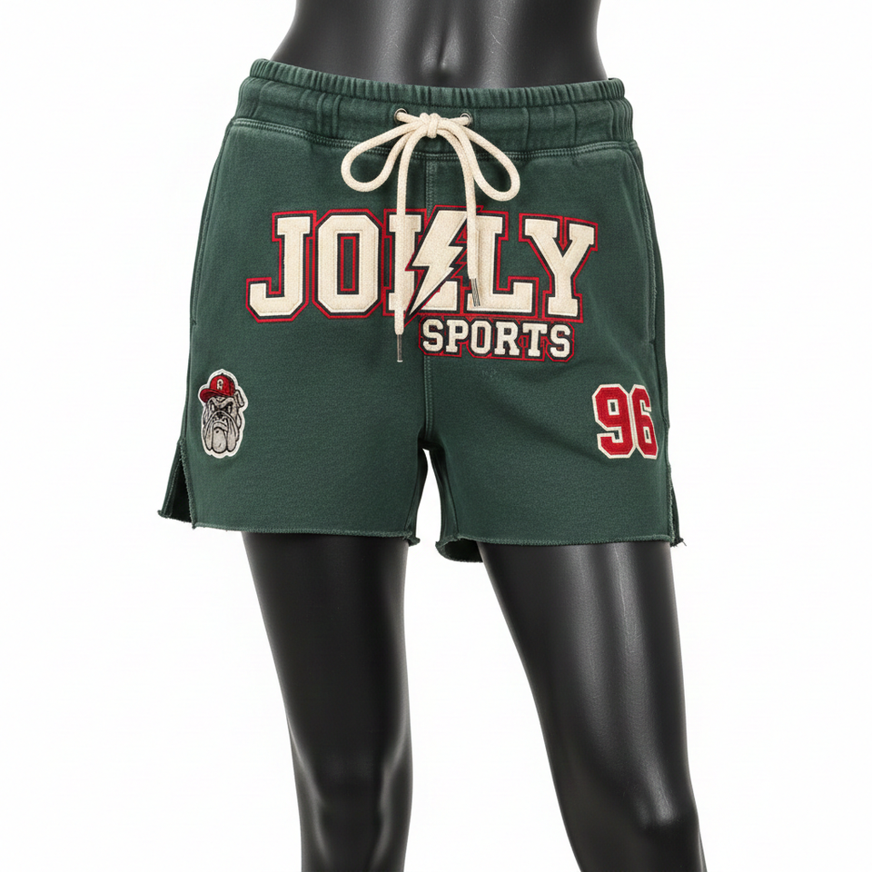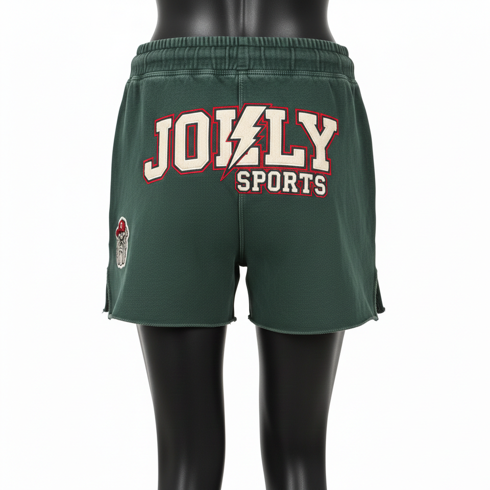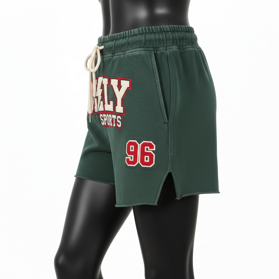 กางเกงขาสั้นผ้าฝ้ายผสมโพลีเอสเตอร์สำหรับผู้หญิง สีเขียว ขอบดิบ แต่งลายปักเชนีล พร้อมปักโลโก้ตามสั่ง