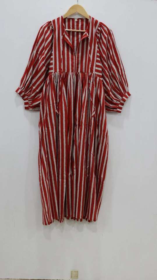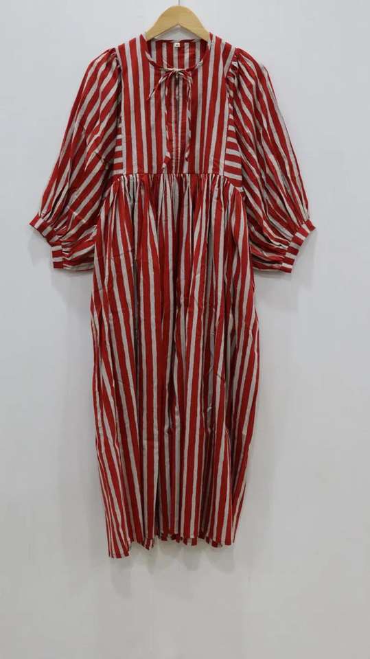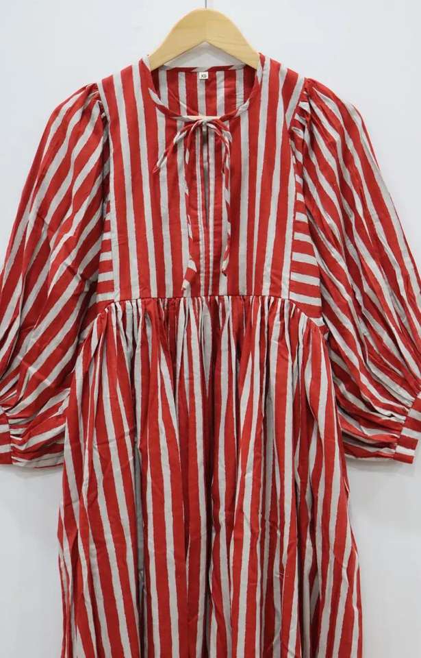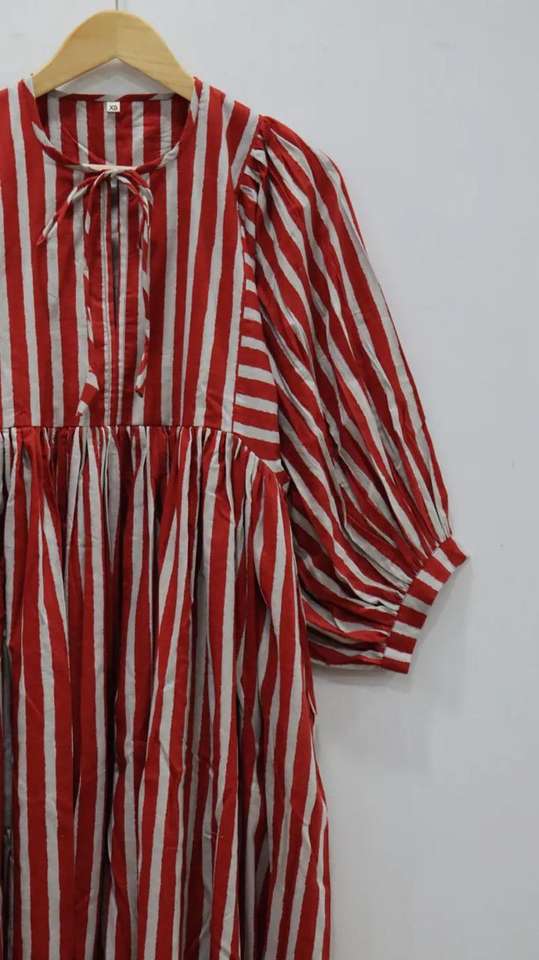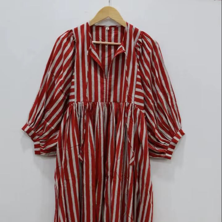 ชุดเดรสผ้าฝ้ายลายทางแบบมีดีเทลผ้าก๊อซ: ลายพิมพ์บล็อก คอเสื้อแบบลึก
