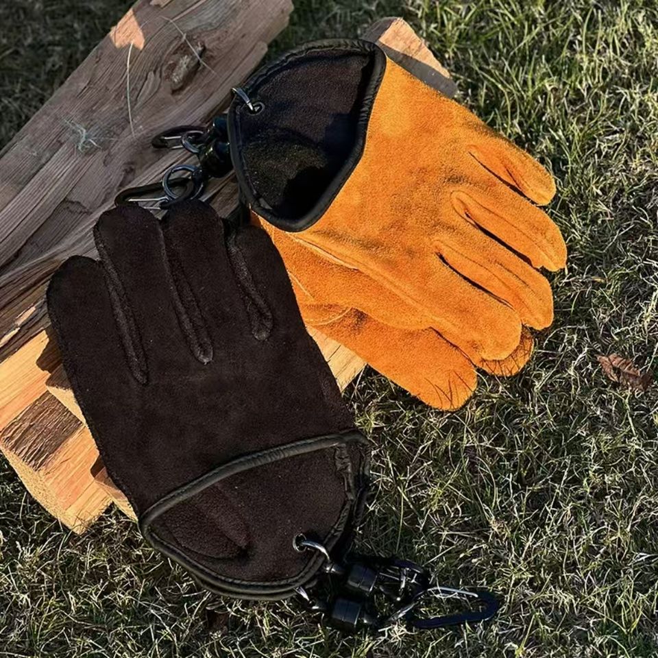 หนังวัวแท้ ทนความร้อน ป้องกันน้ำร้อนลวก ถุงมือบาร์บีคิวแบบพกพา แขวนได้ กันไฟ กันลื่น ตกปลา กีฬากลางแจ้ง