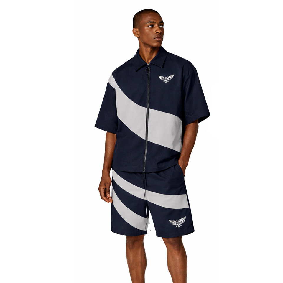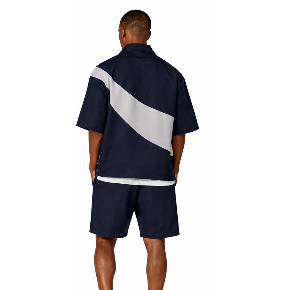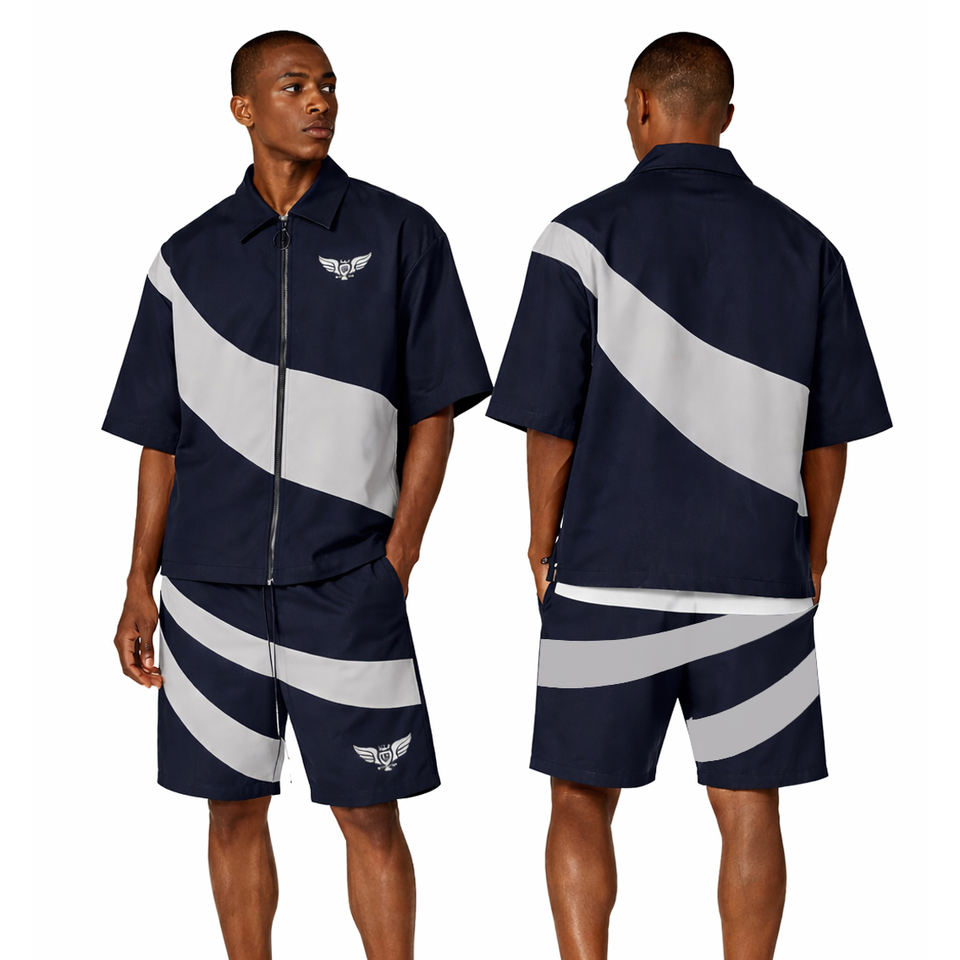 ชุดวอร์มผู้ชายสีน้ำเงินกรมท่า เสื้อแขนสั้นมีซิปและกางเกงขาสั้น ชุด 2 ชิ้น ชุดลำลองฤดูร้อน ชุดกีฬา ชุดออกกำลังกาย ชุดสตรีทแวร์
