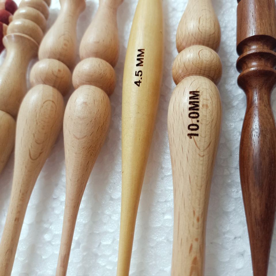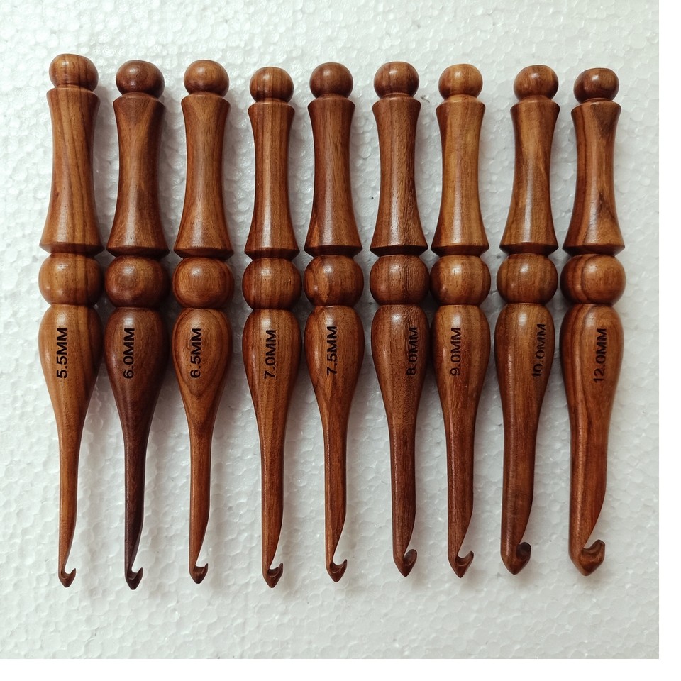ตะขอถักโครเชต์ทำจากไม้ที่ทำจากชิงชันมีขนาดตั้งแต่3.5มม. เป็นต้นไปเหมาะสำหรับการขายต่อโดยร้านขายอุปกรณ์ถัก
